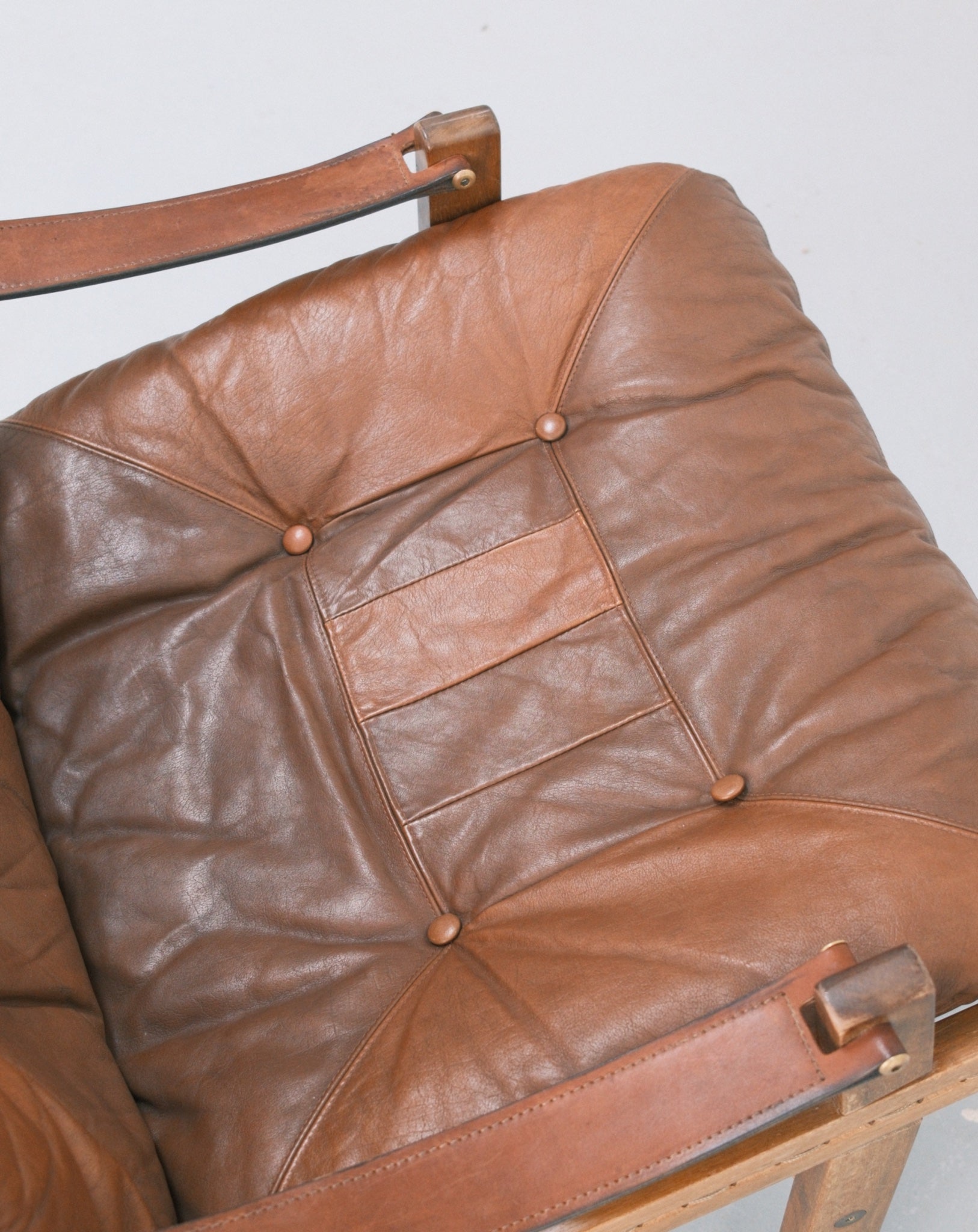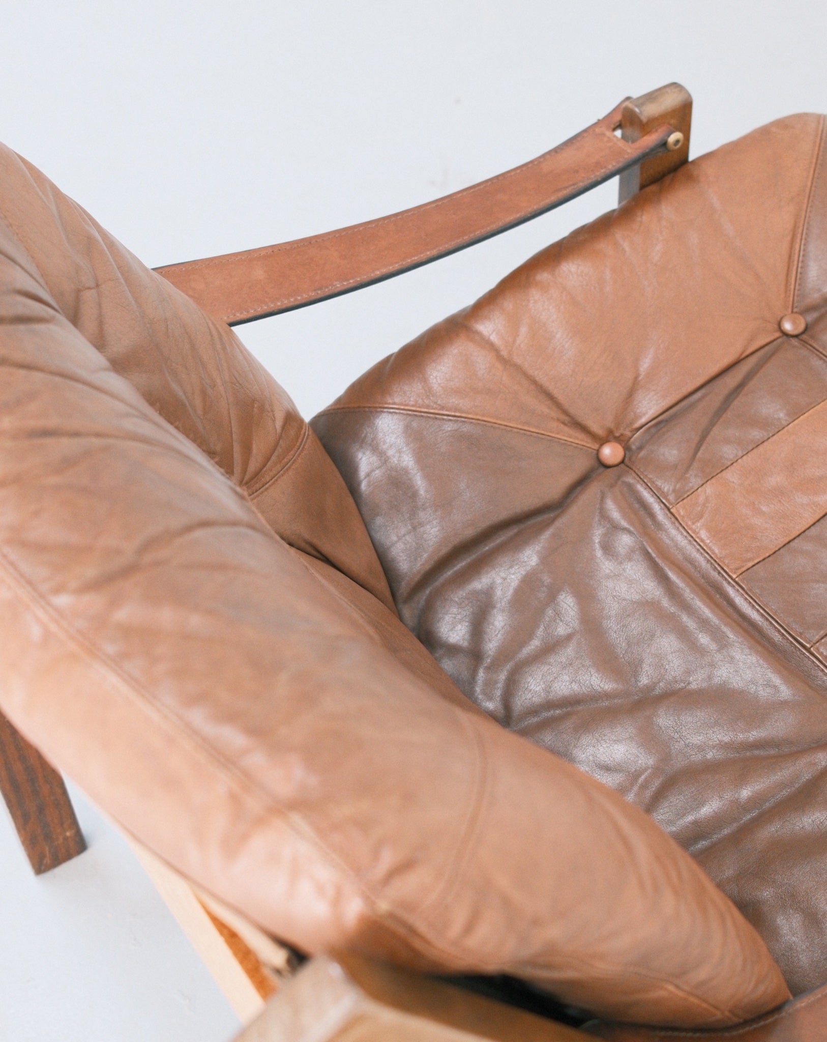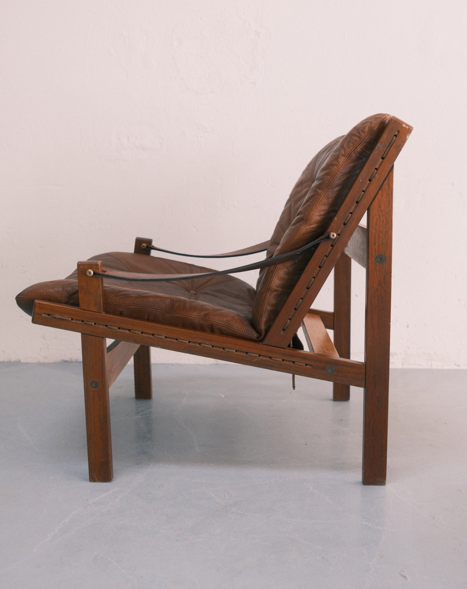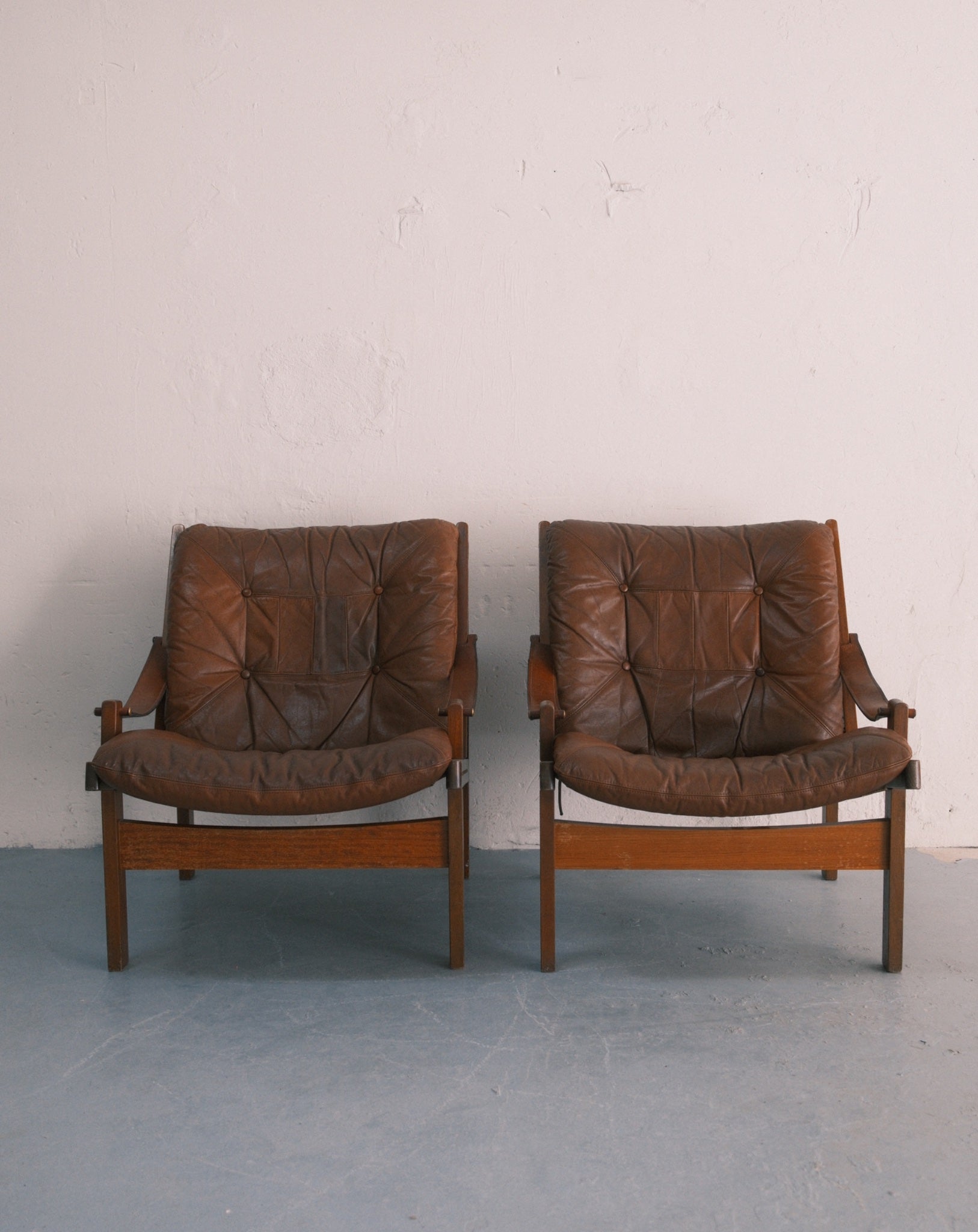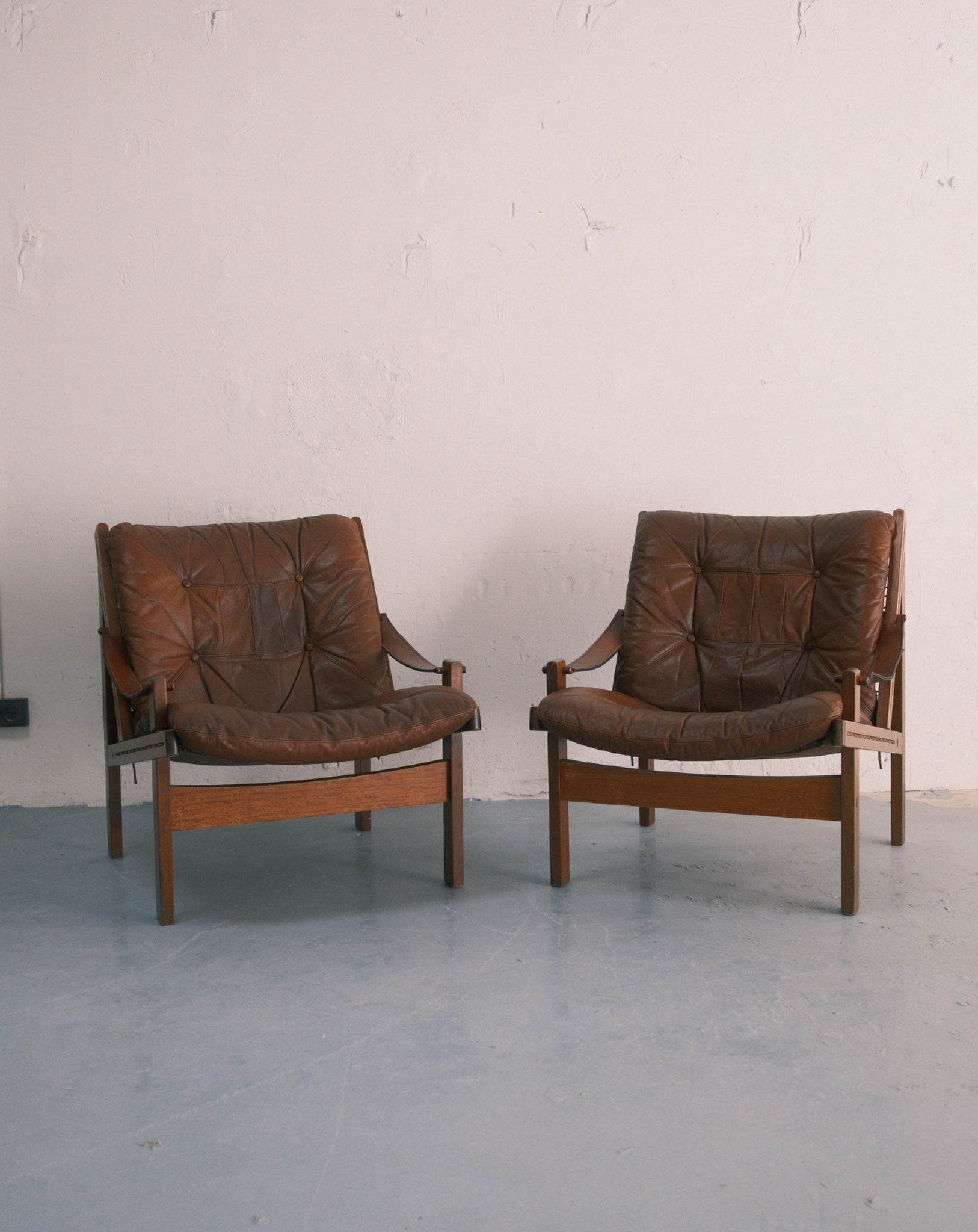 An enduring icon of Scandinavian modernism, this pair of Hunter Safari chairs by Torbjørn Afdal reflects a design language rooted in clarity, craftsmanship, and functional elegance. Designed for Bruksbo in the 1960s, the chairs feature solid wooden frames paired with suspended leather seating, their construction both lightweight and structurally expressive. The interplay of taut leather and warm wood creates a refined tension between strength and comfort. Timeless and quietly commanding, this duo stands as a collectible addition to both modern and classic interiors.