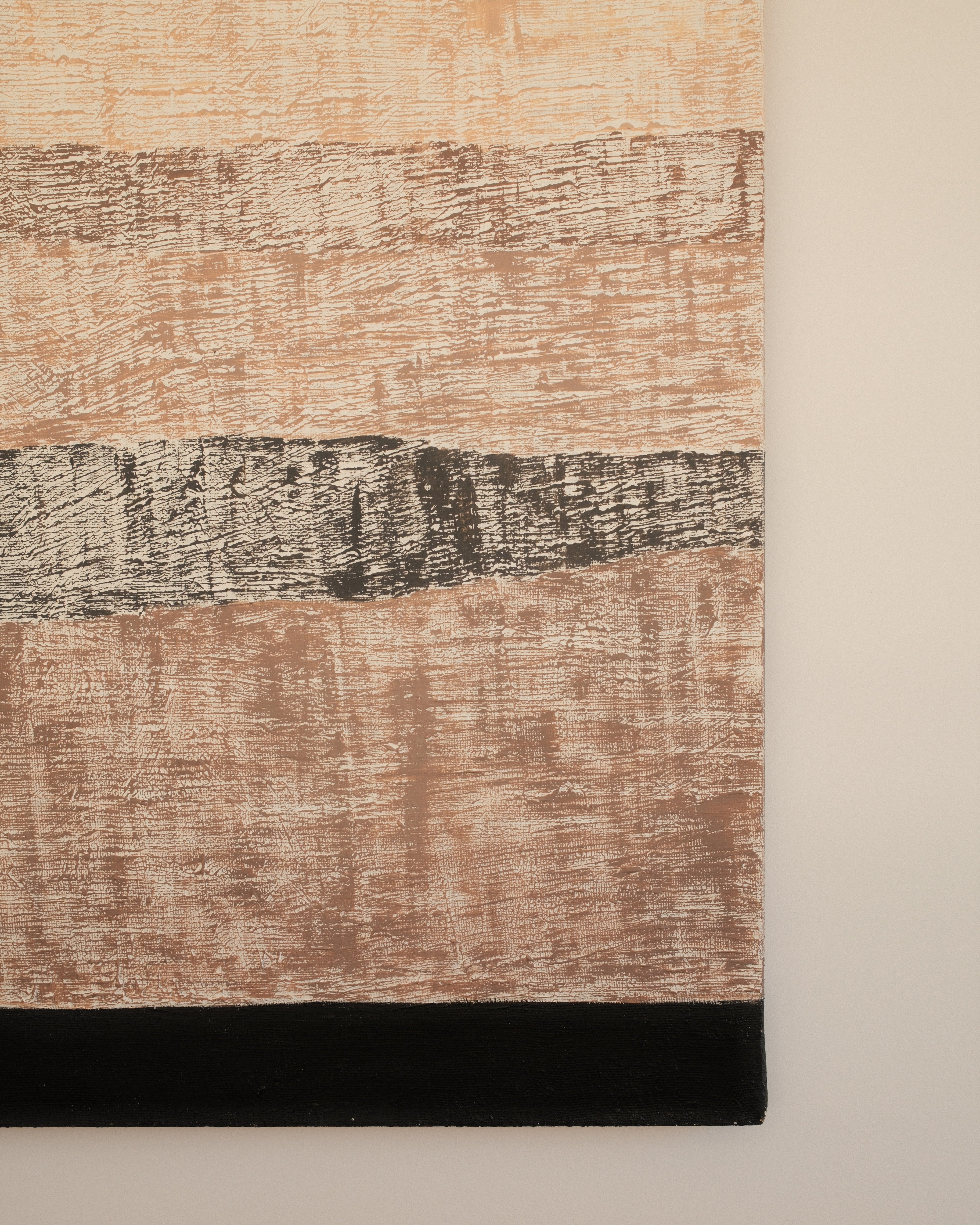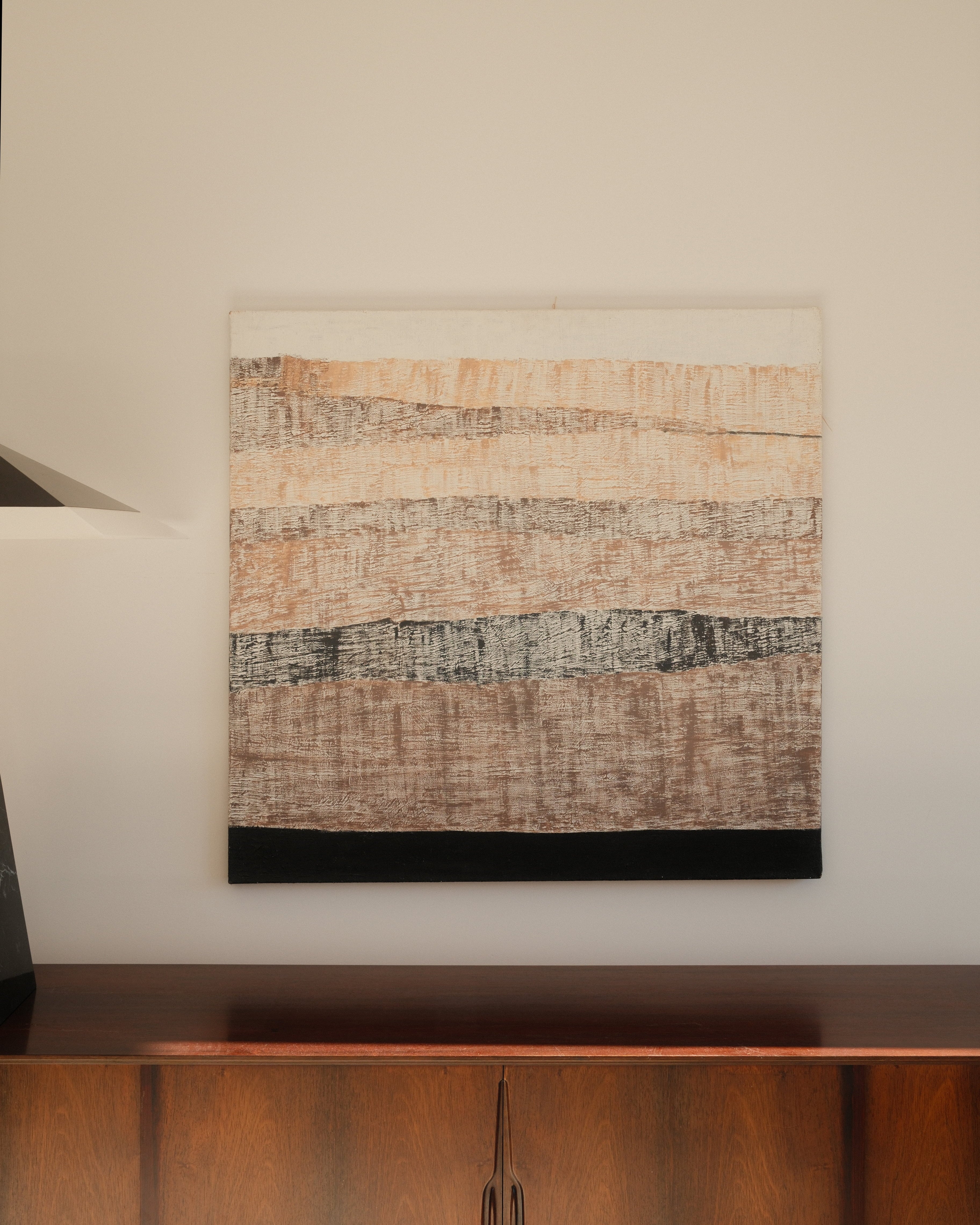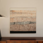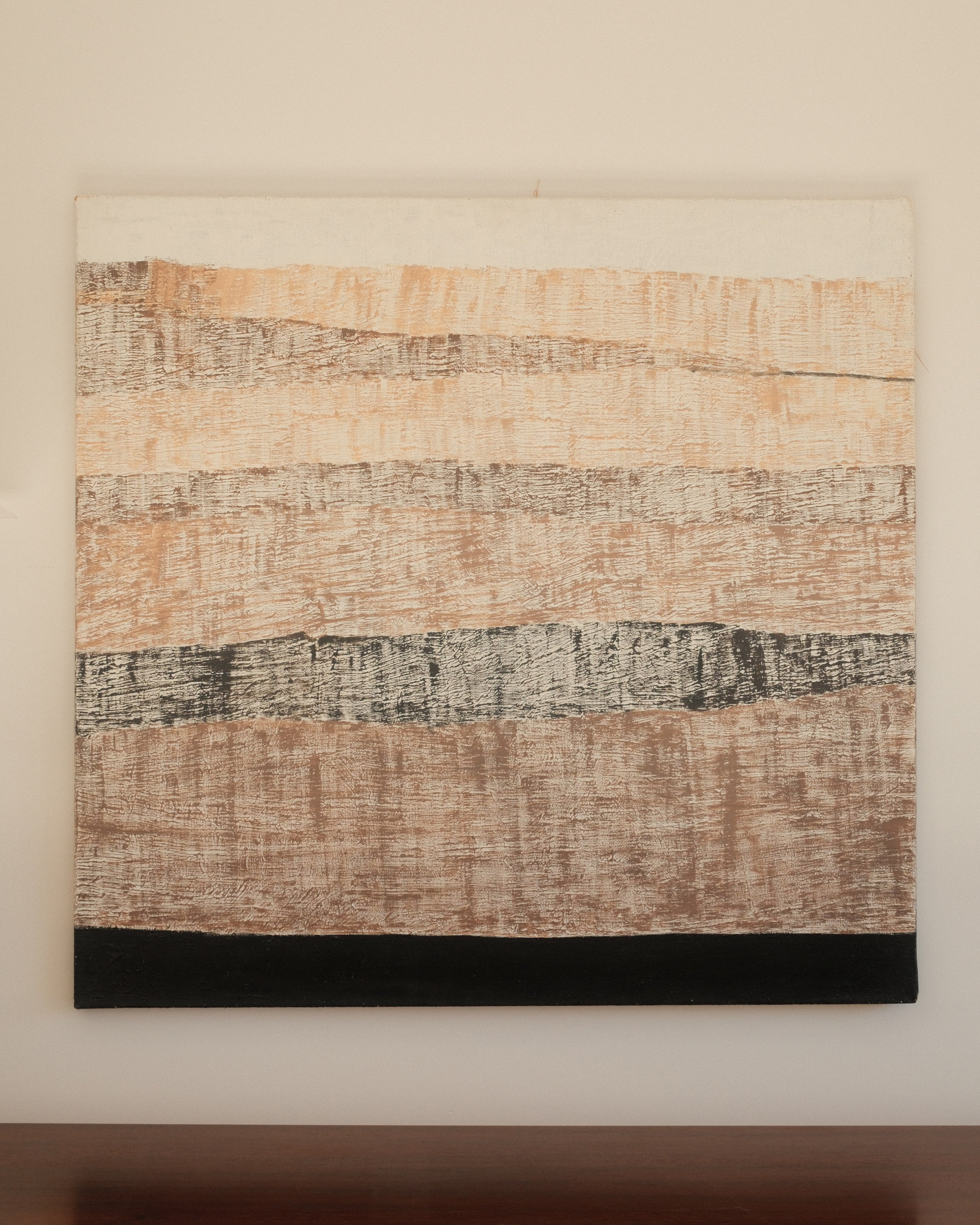 A contemplative abstract composition by Andie GRANDE (1953–2024), titled Lenten Sunday. Signed, dated, and titled on the reverse. This textured painting evokes a landscape of muted tones and layered horizontals, inviting quiet reflection.