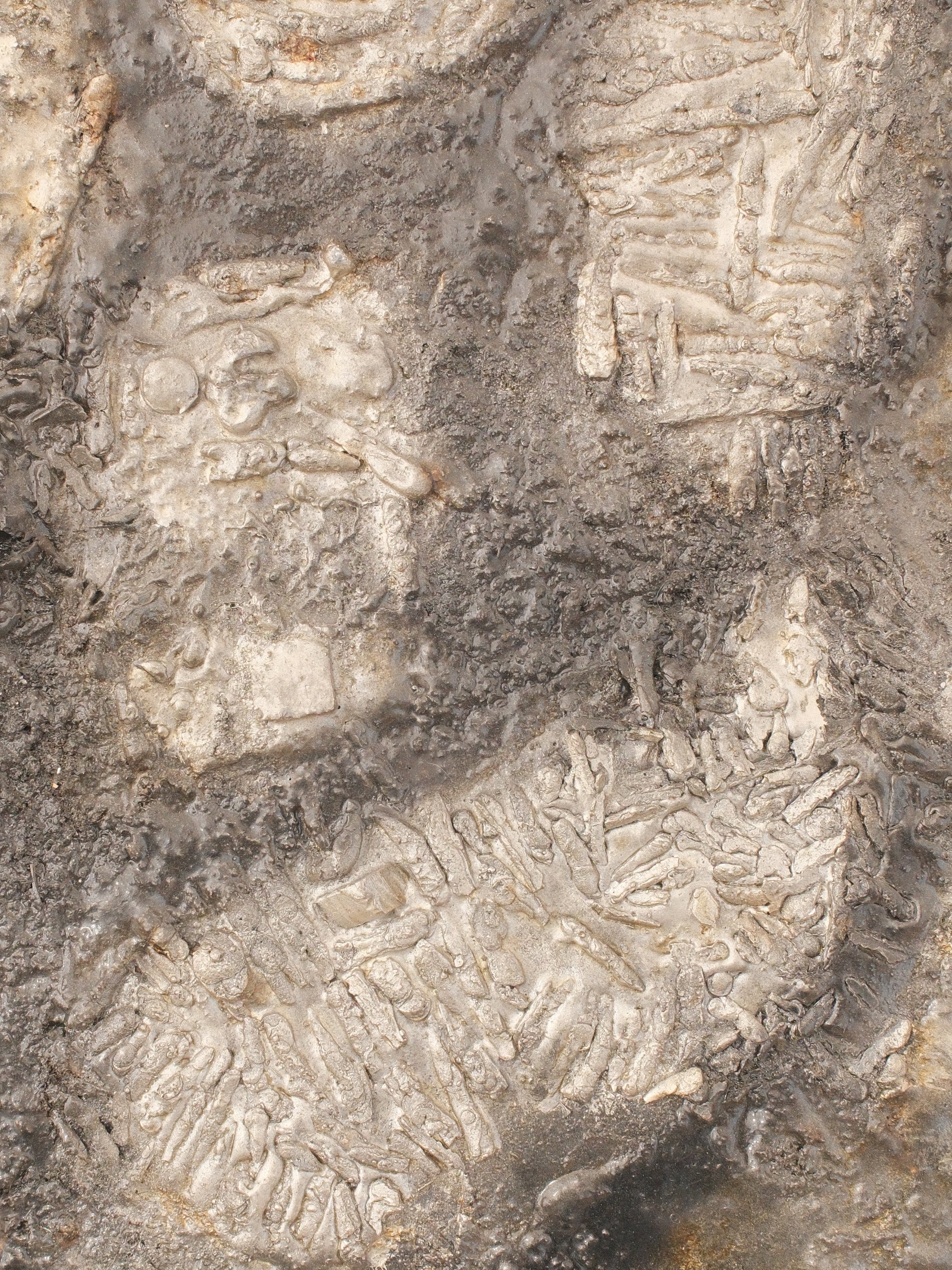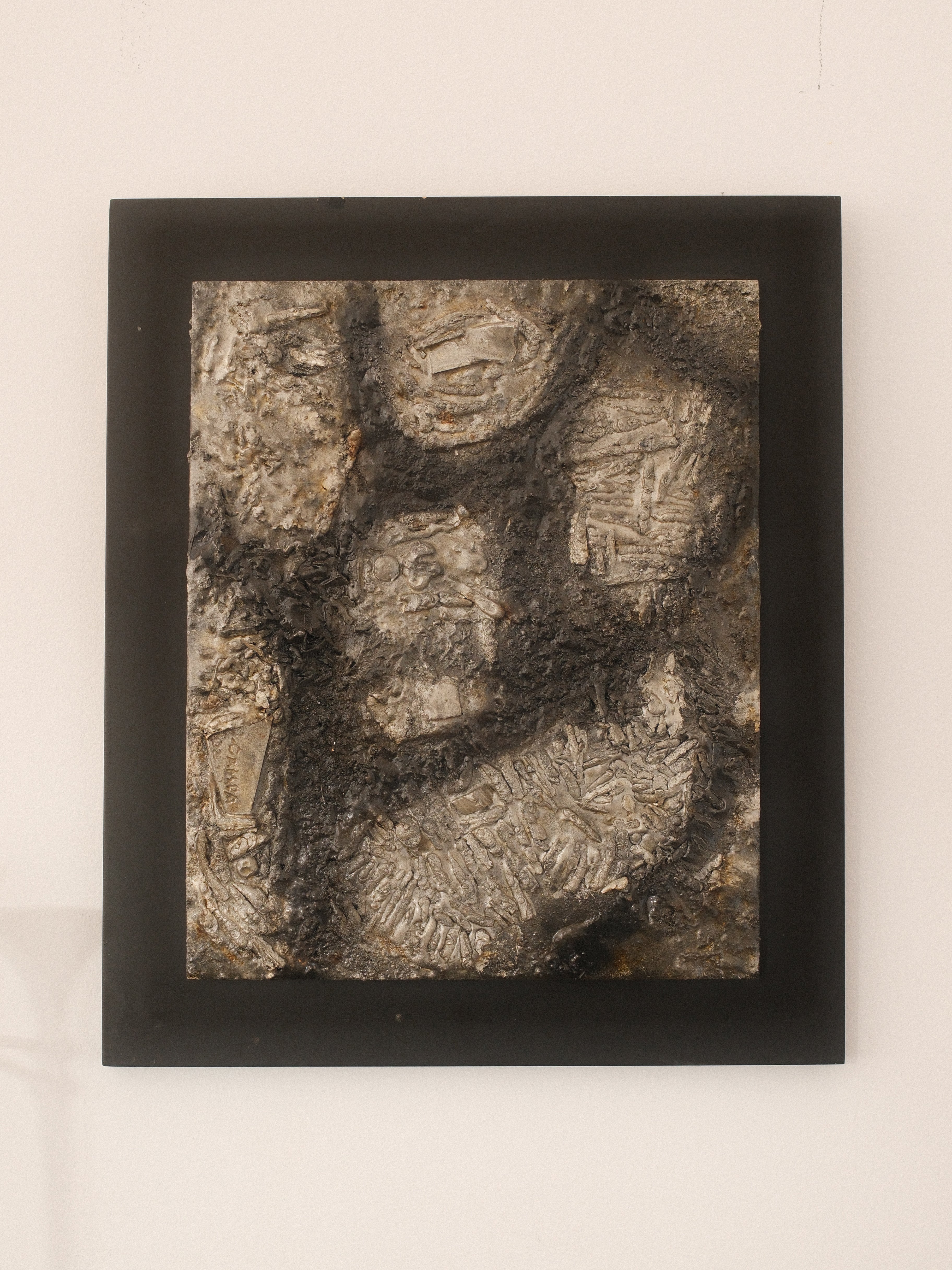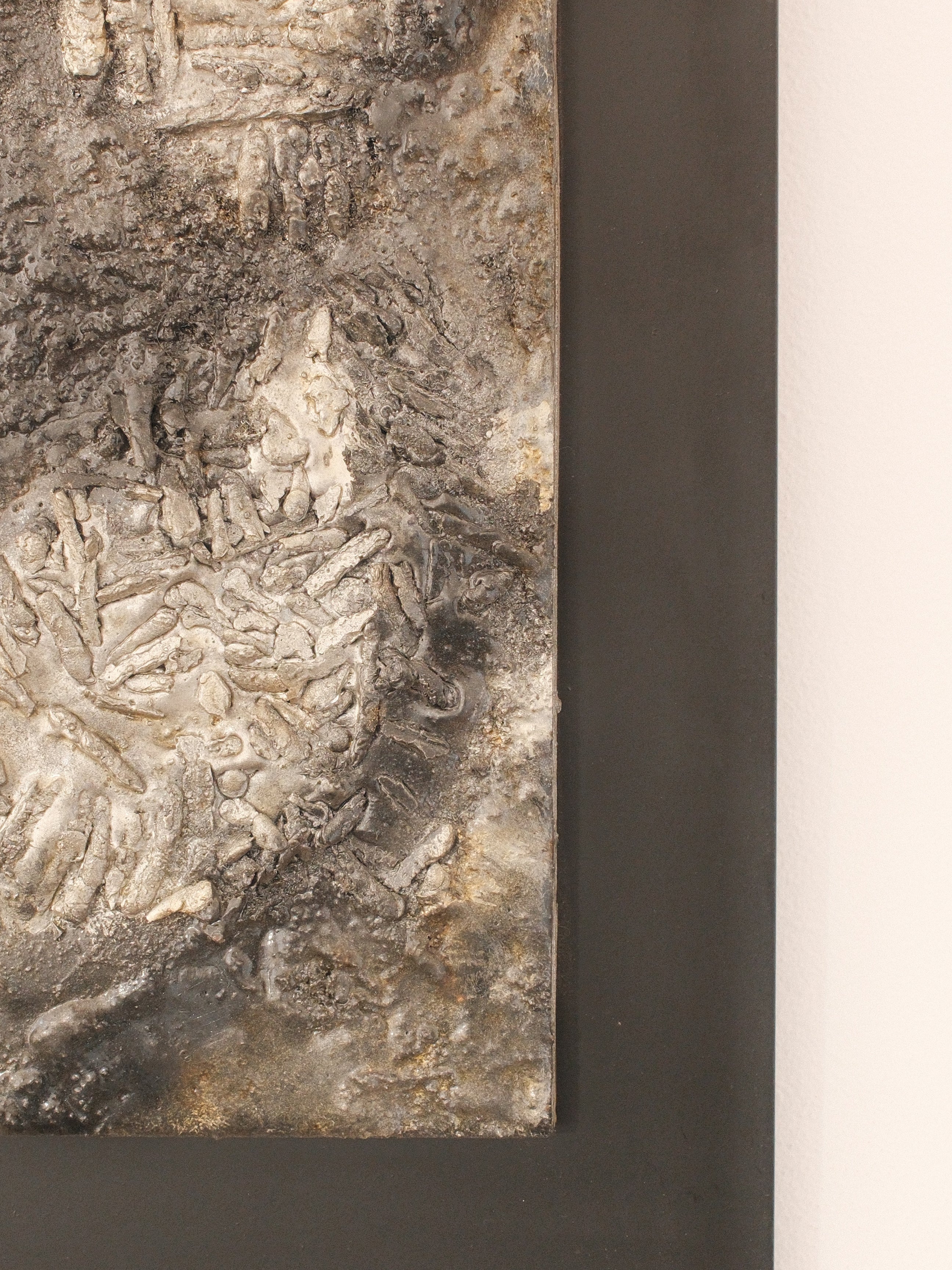 Medium: Painted resin bas-relief on wood panel; signed and dated “2002” lower right