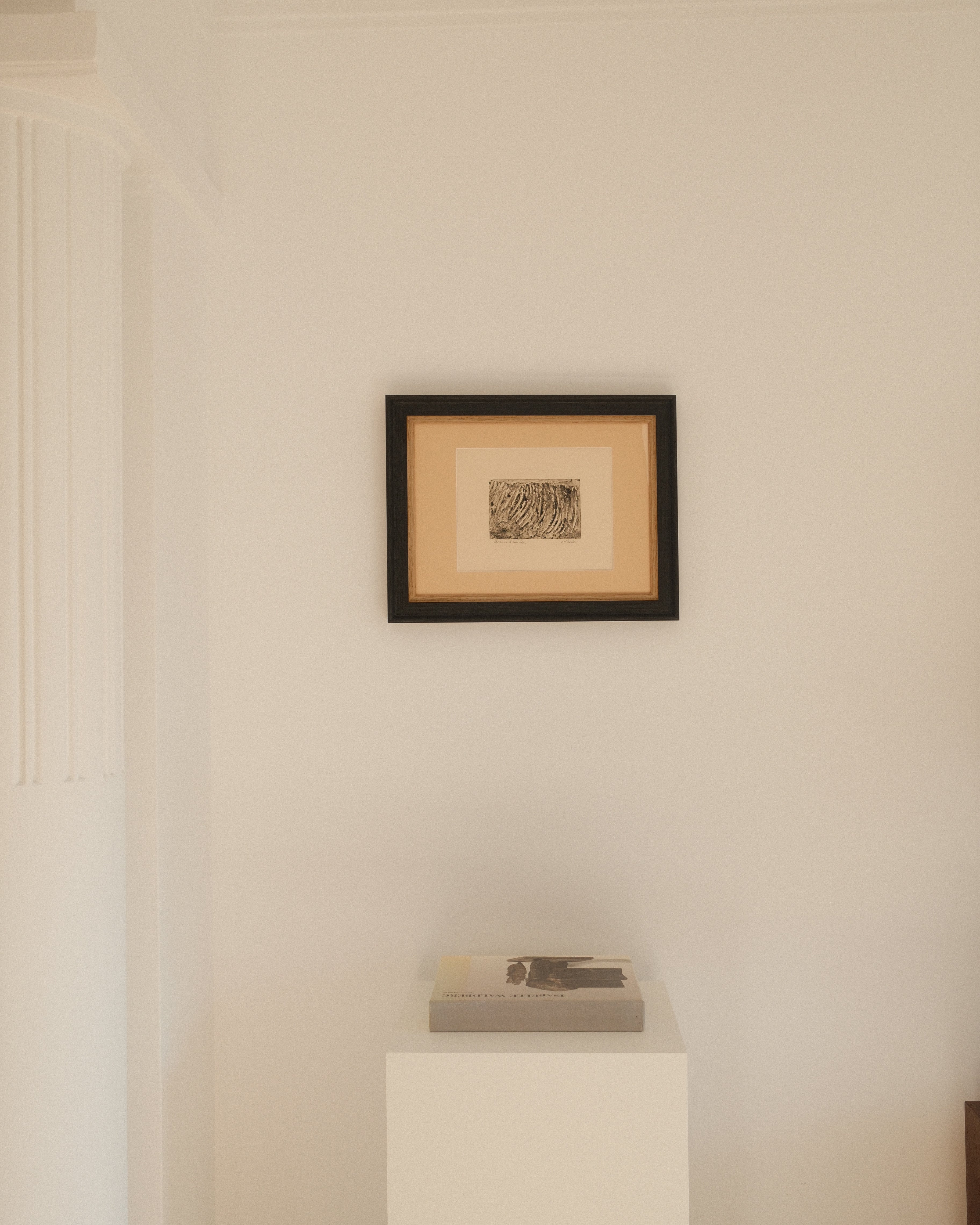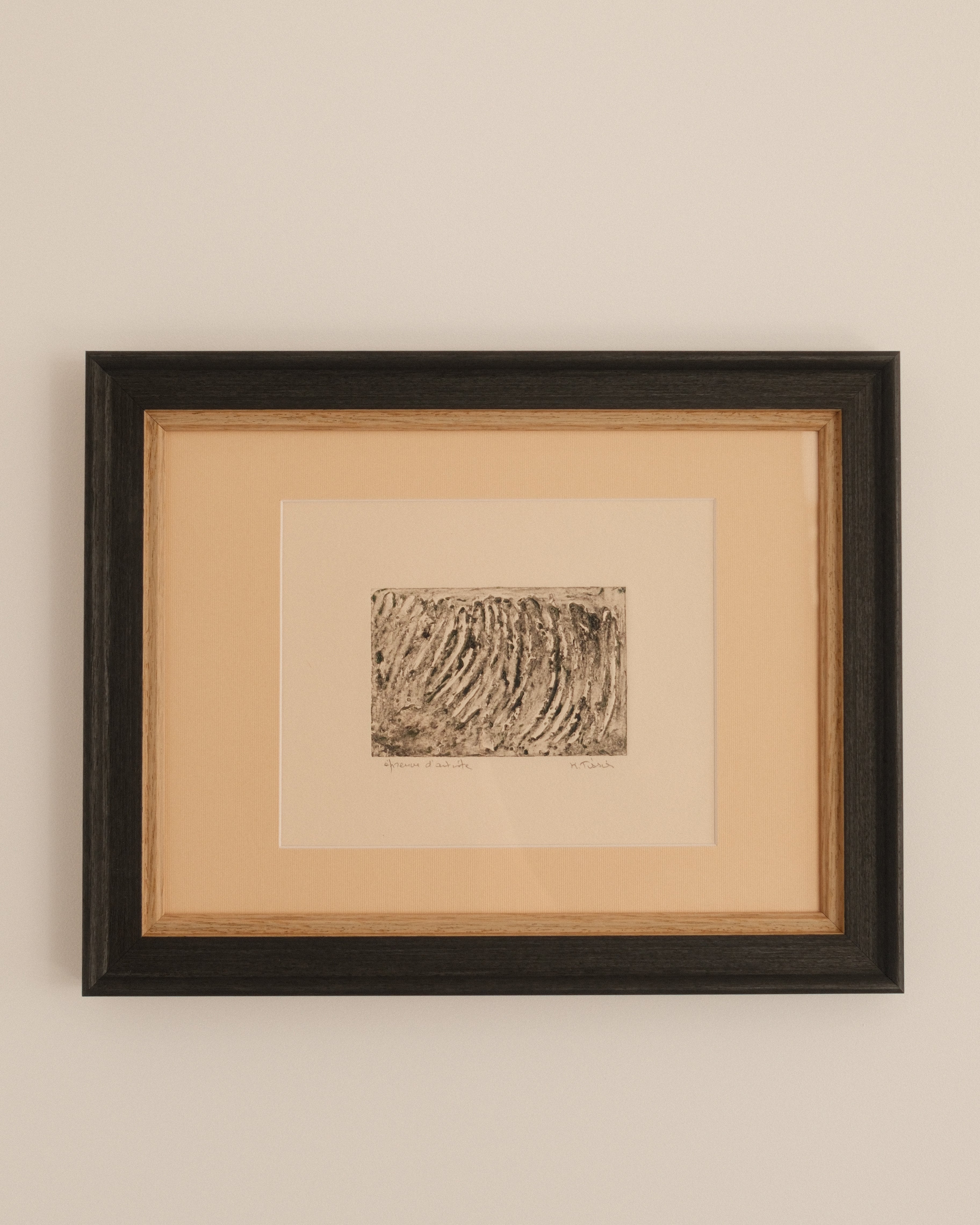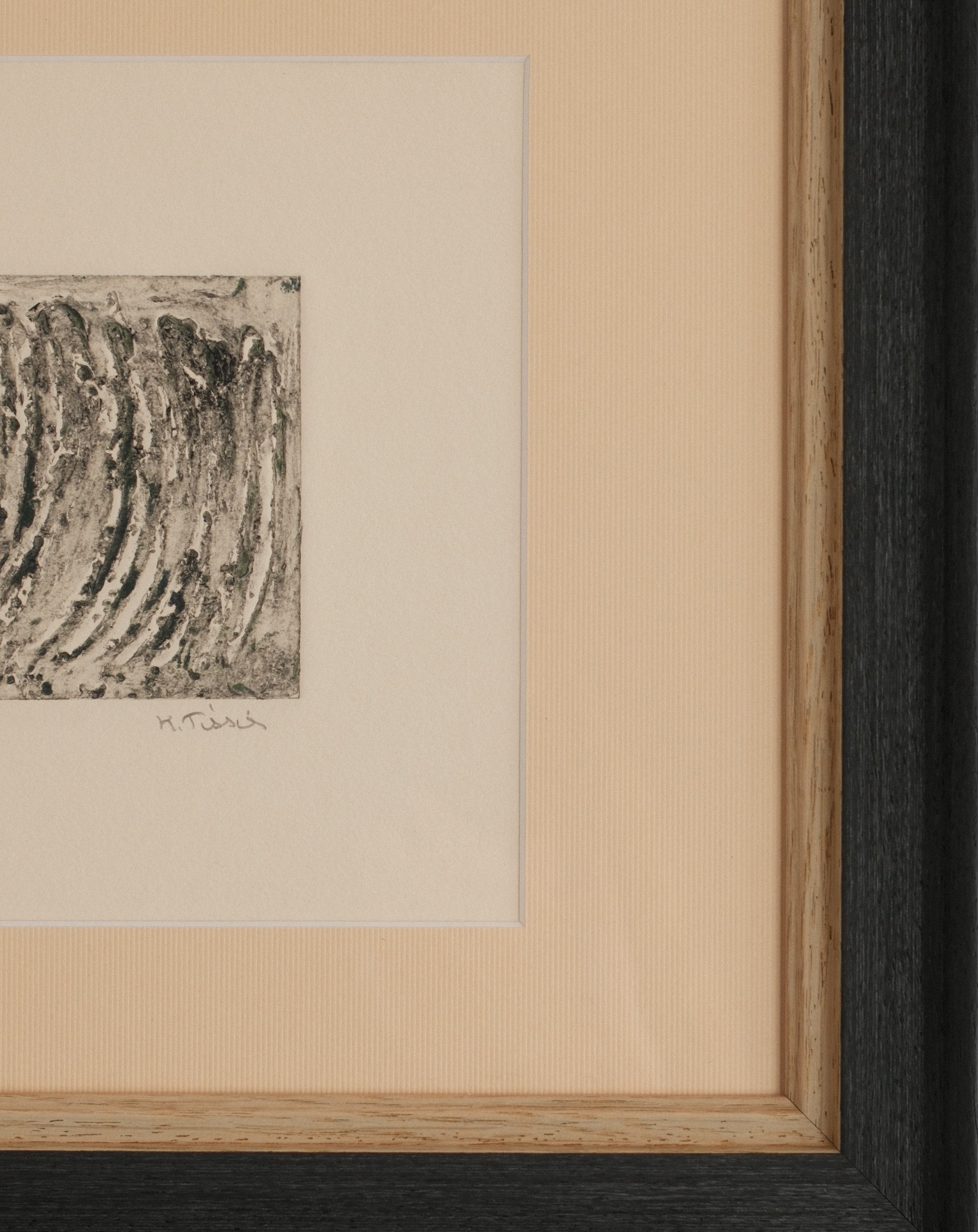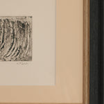 Sweeping black gestures rush across a field of white in this untitled etching, creating an arresting rhythm of light and dark. Kristine Tissier (1928–2010)—a French abstract painter and printmaker trained at the École nationale supérieure des beaux-arts in Paris—was known for gestural abstraction, rich textures, and dynamic black-and-white compositions, all of which find exquisite expression in this work. The composition’s bold, flowing strokes and layered tonal contrasts lend it a refined yet visceral presence—each mark a testament to Tissier’s masterful balance of spontaneity and control.