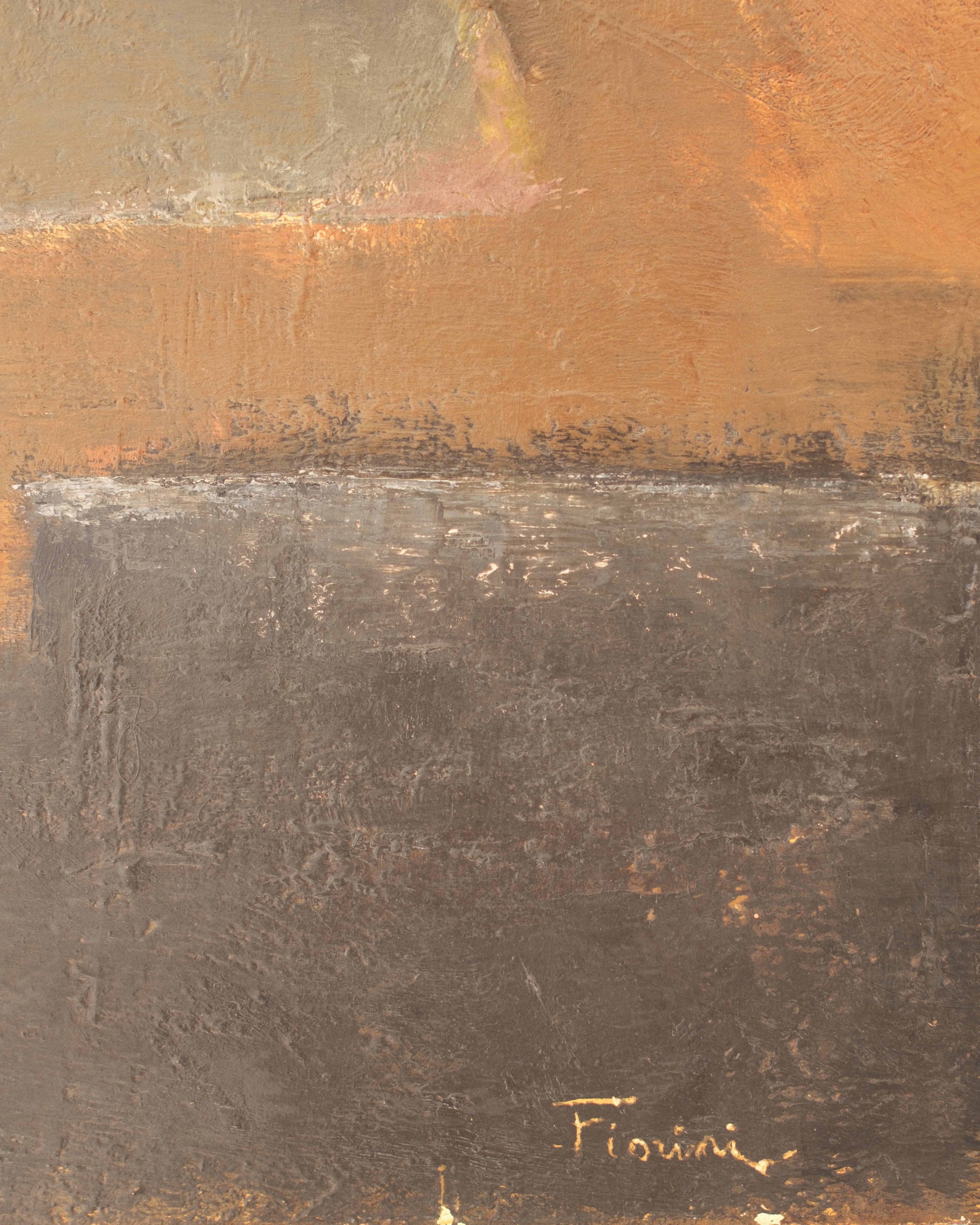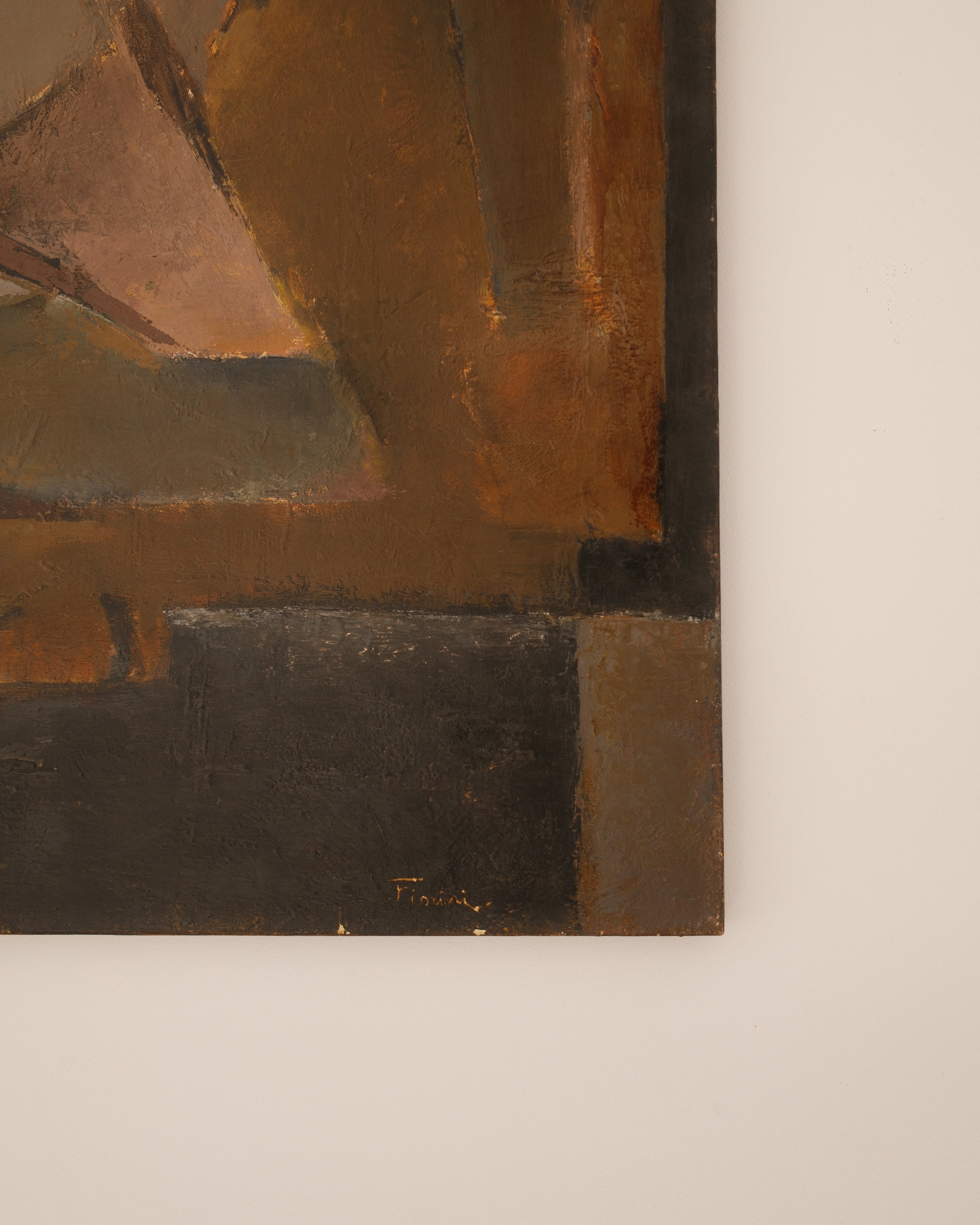 In Nature morte à la lampe à pétrole, the humble subject of an oil lamp becomes the quiet protagonist of a carefully structured composition. The warm glow suggested by the lamp contrasts with deeper surrounding tones, creating a subtle play of light and shadow across the canvas. Fiorini’s handling of oil paint is deliberate and balanced: forms are solid yet softened by nuanced transitions, and the palette unfolds in restrained harmonies that lend the scene a sense of calm introspection. The still life tradition is approached not as mere representation, but as an exploration of atmosphere and presence.