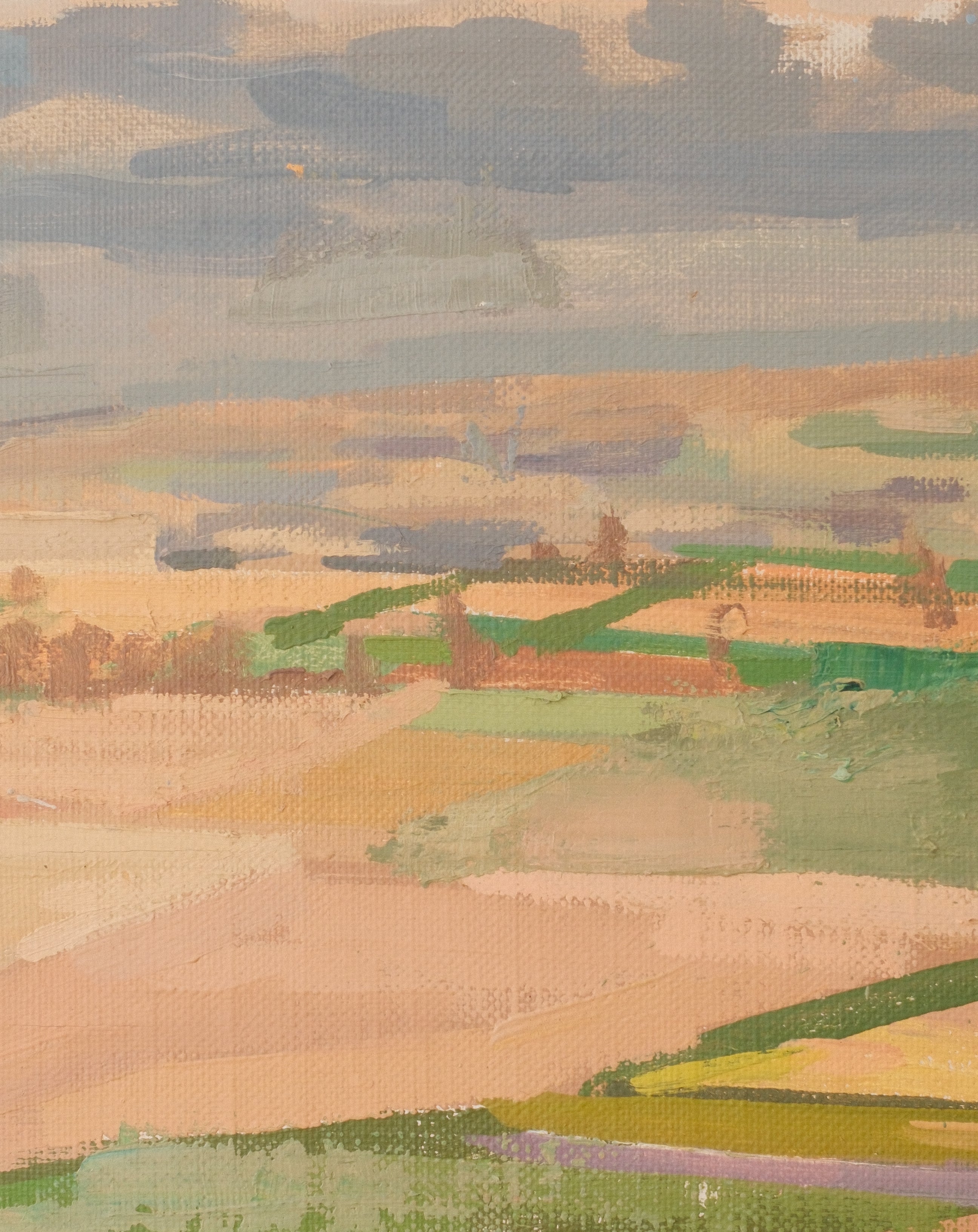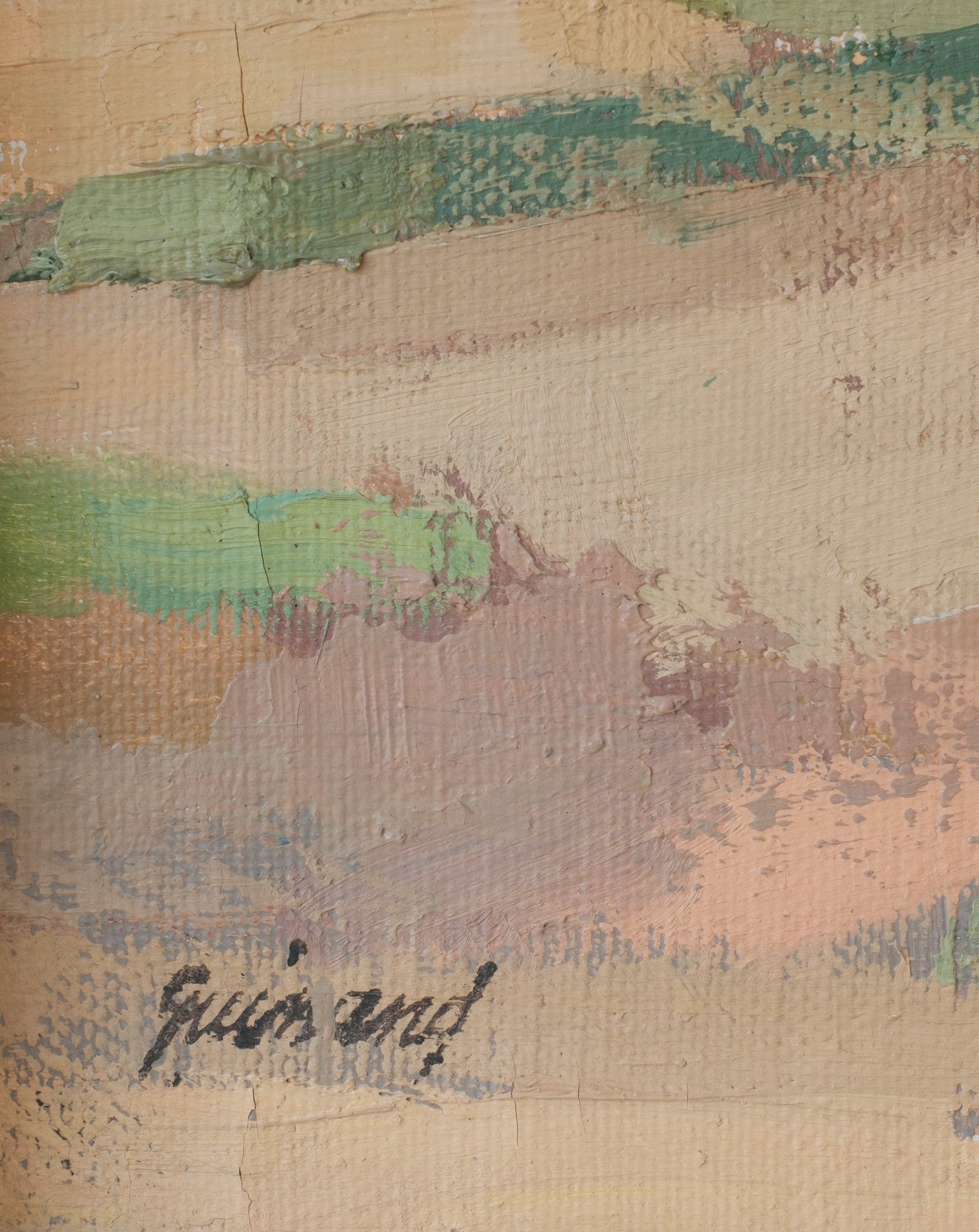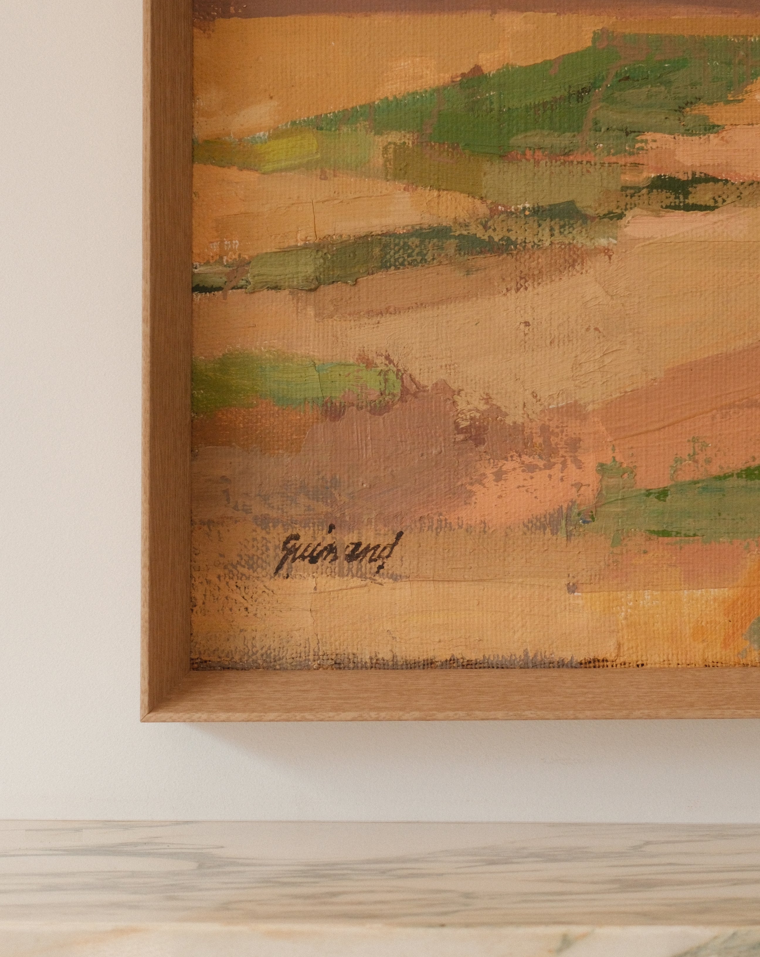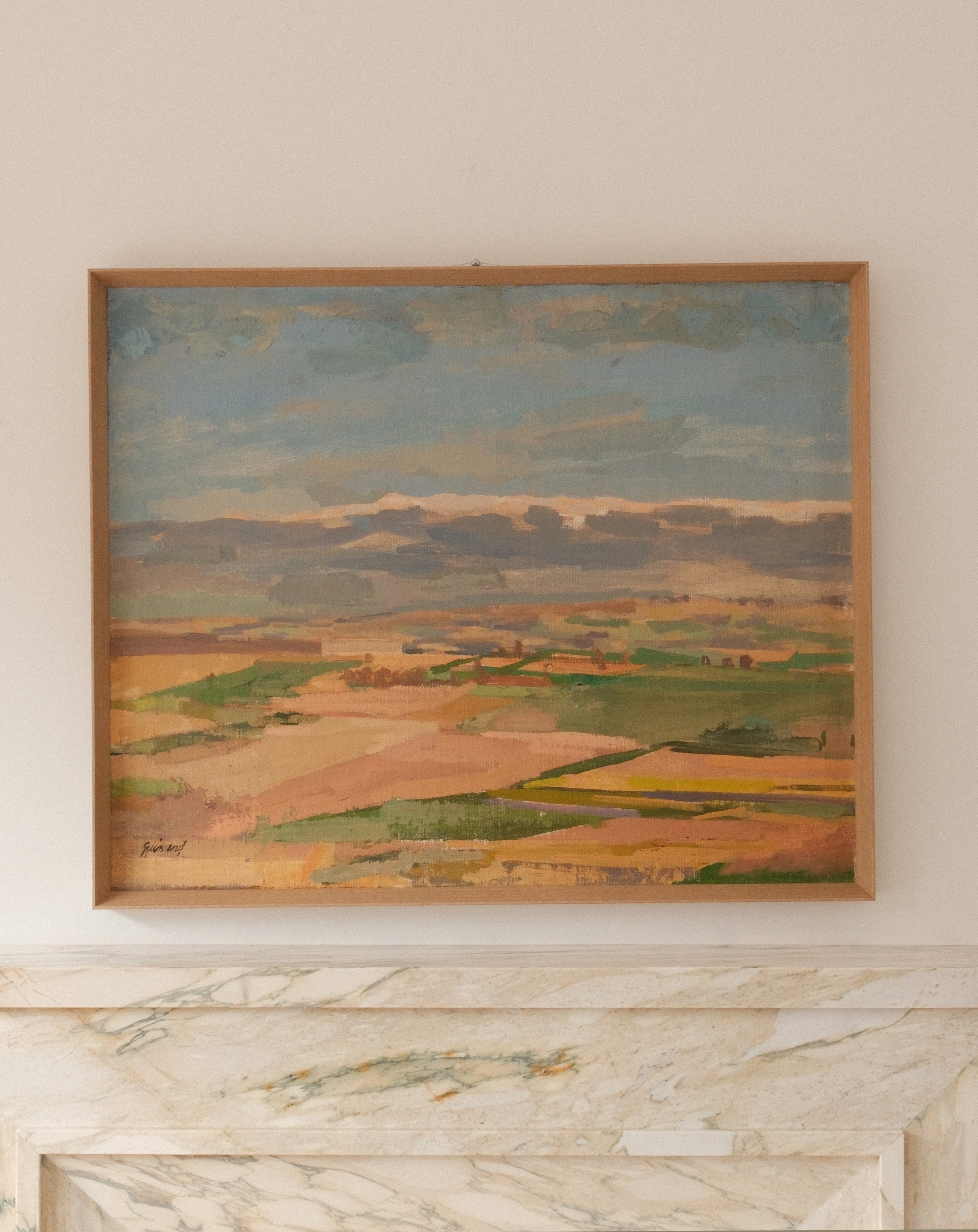 Though Swiss by birth, Guinand spent long periods working in France, and his landscapes often reveal a subtle dialogue between the clarity of Alpine scenery and the broader, luminous treatment of space found in mid-century European landscape painting. Here, the sweeping view and balanced structure give the composition both depth and calm, inviting the viewer into a contemplative encounter with the landscape.