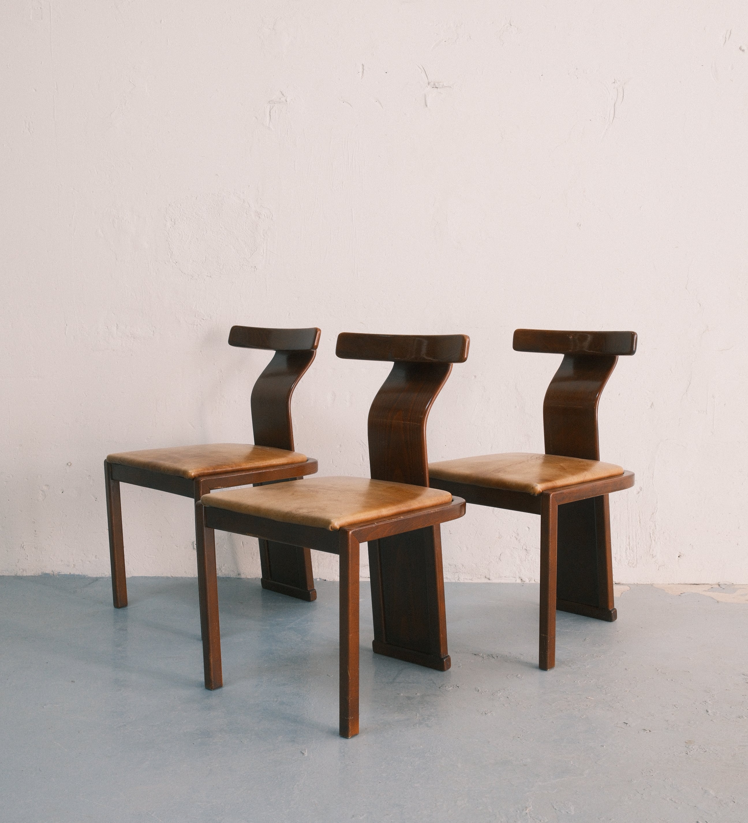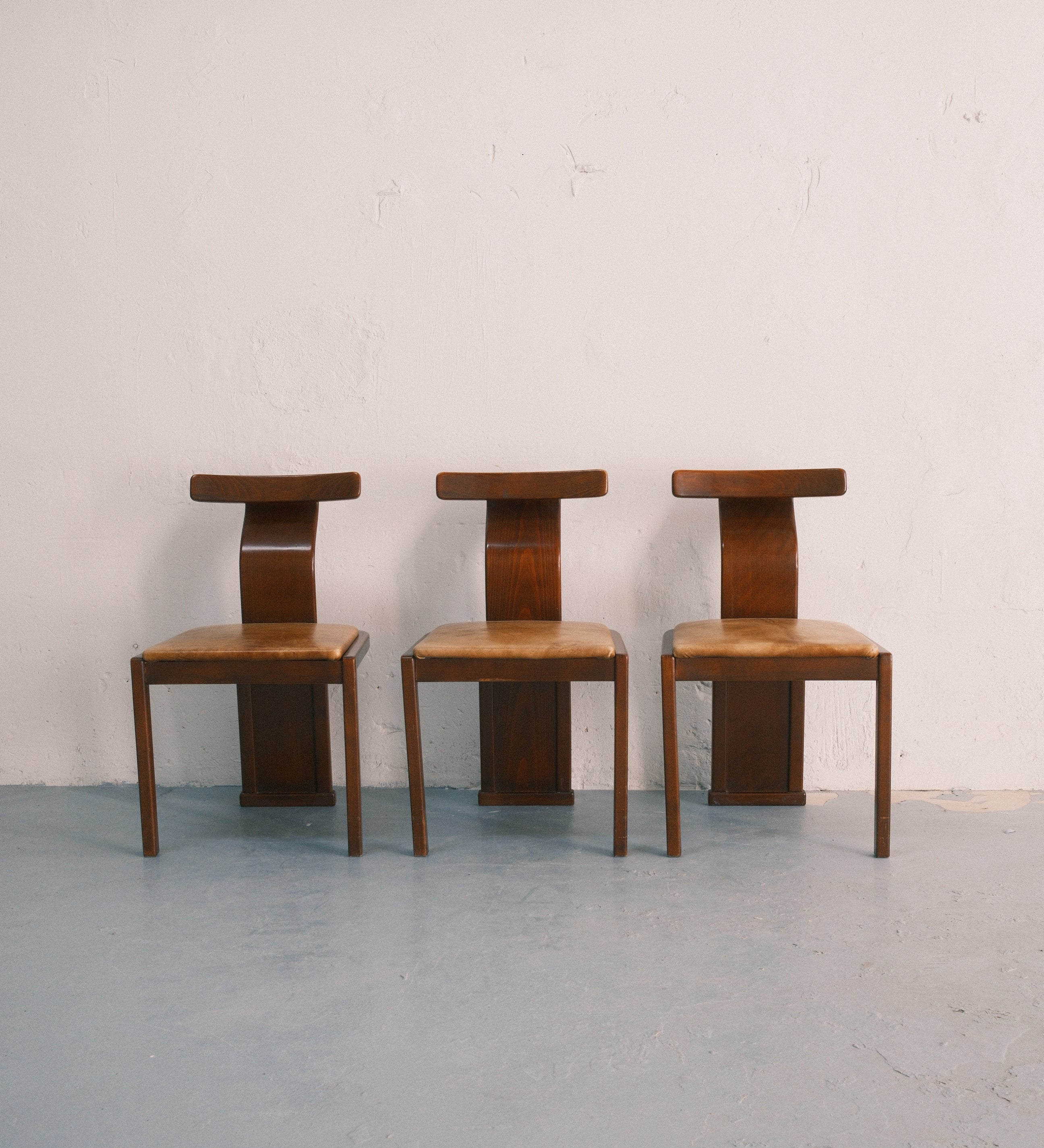 A Trio of Vintage Italian Walnut & Leather Dining Chairs, 1970s