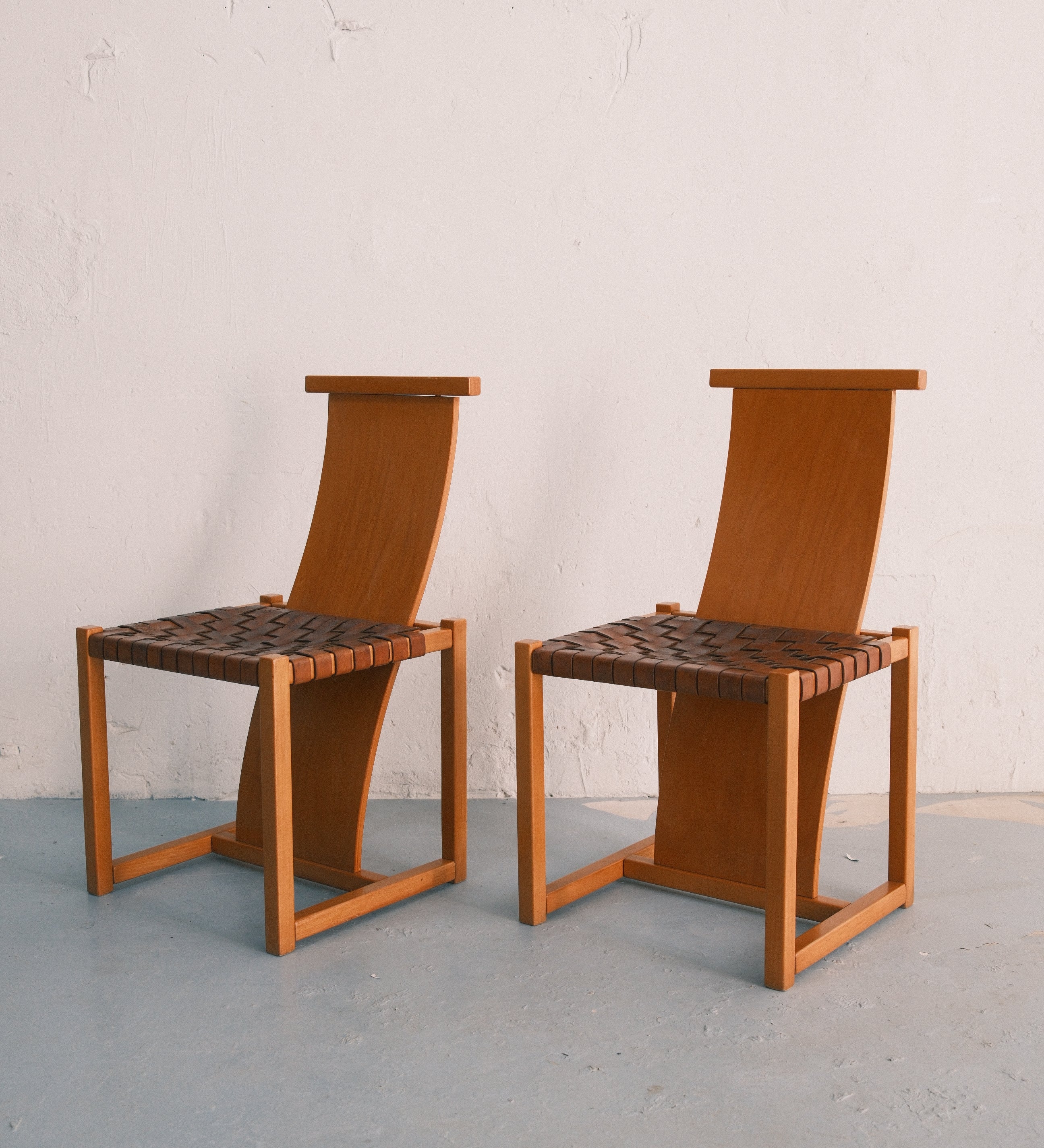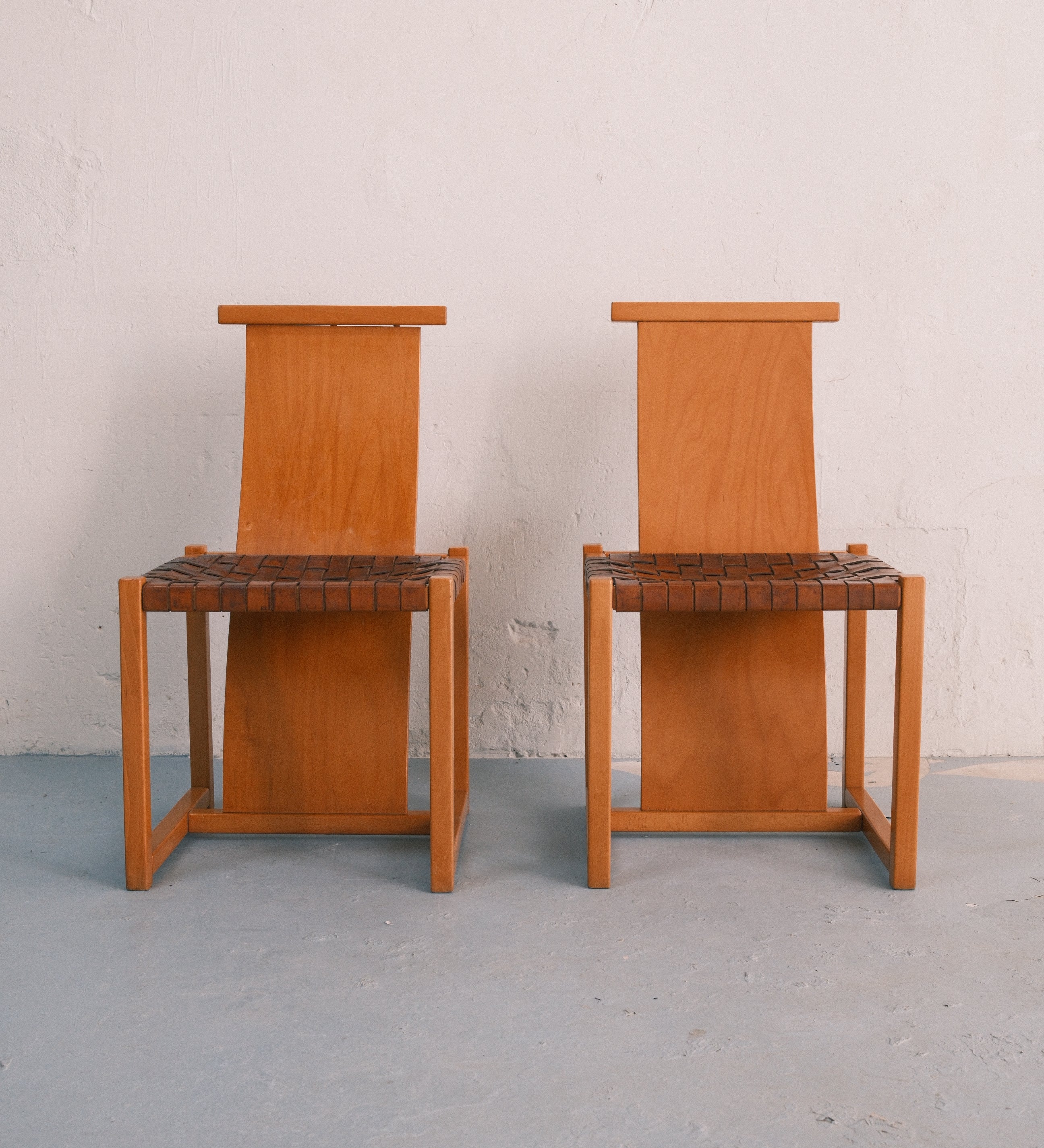 A Trio of Italian Beech and Woven Leather Chairs, 1970s