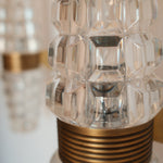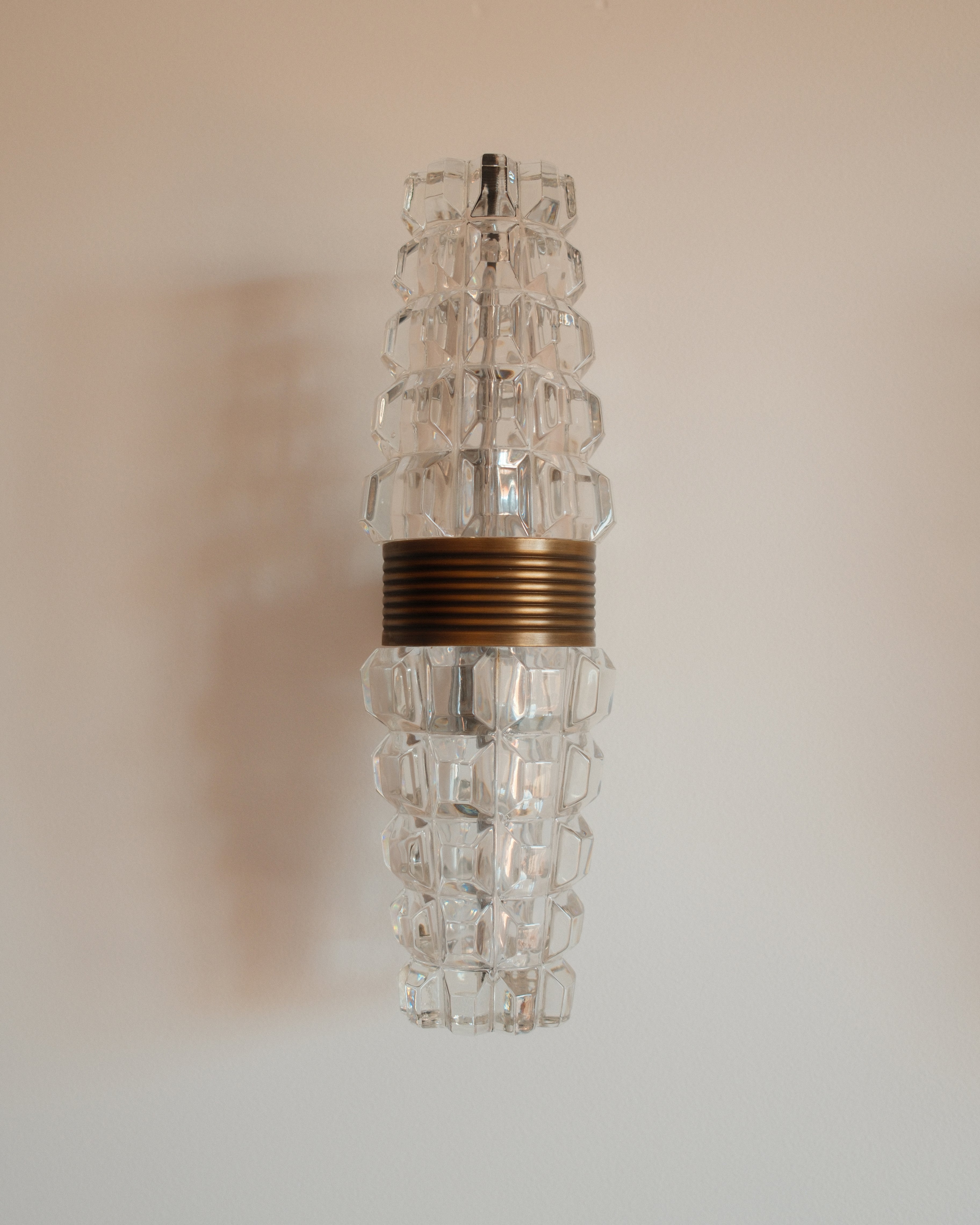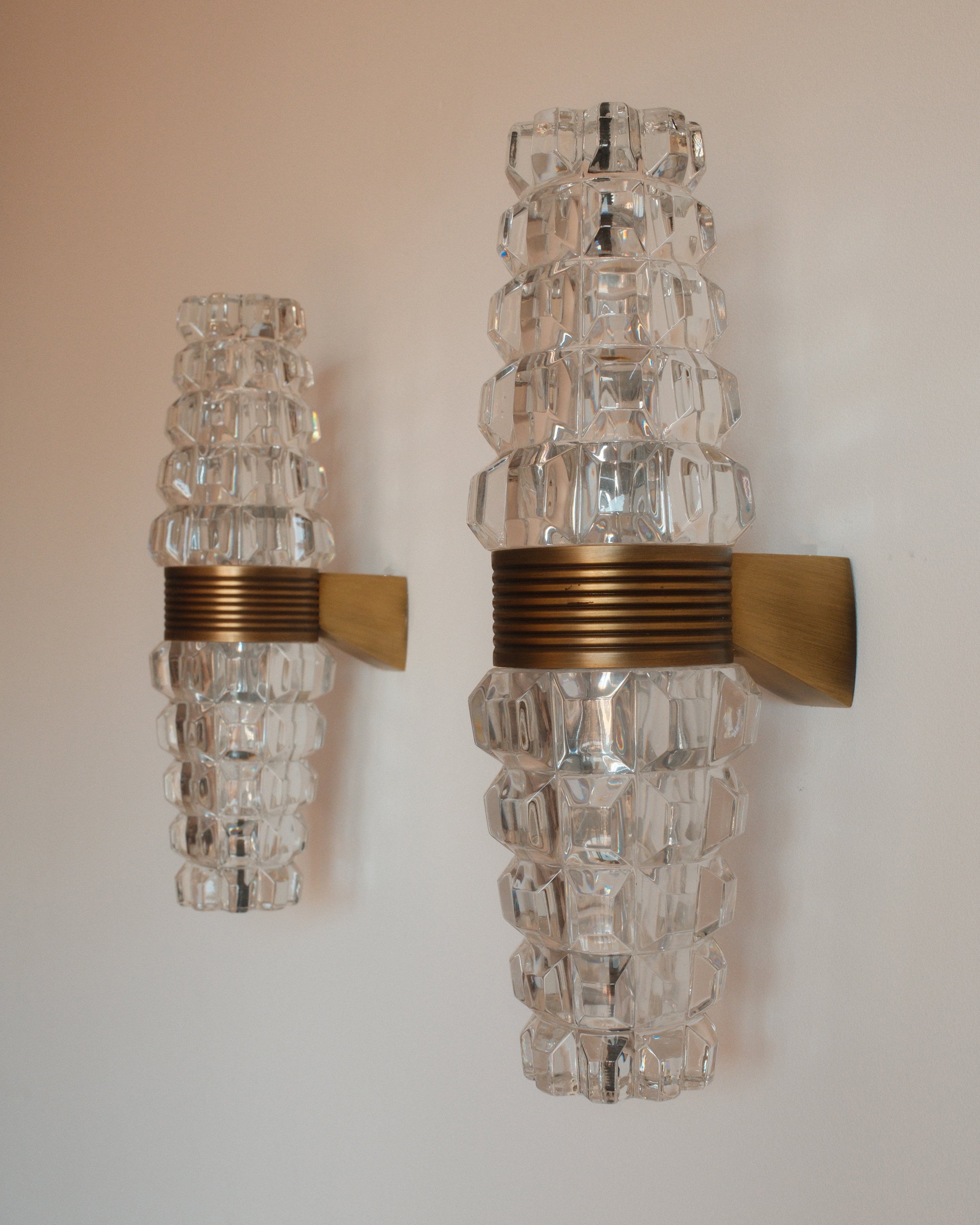 Each sconce is composed of a gilded metal frame adorned with precisely cut crystal elements that refract and diffuse light with exceptional clarity. The faceted crystals create a subtle play of reflections, while the warm gold-toned structure enhances their radiance, producing an atmosphere that is both intimate and luxurious. The compact proportions make them ideal for flanking a mirror, illuminating a corridor, or adding a refined accent to a bedroom or salon.