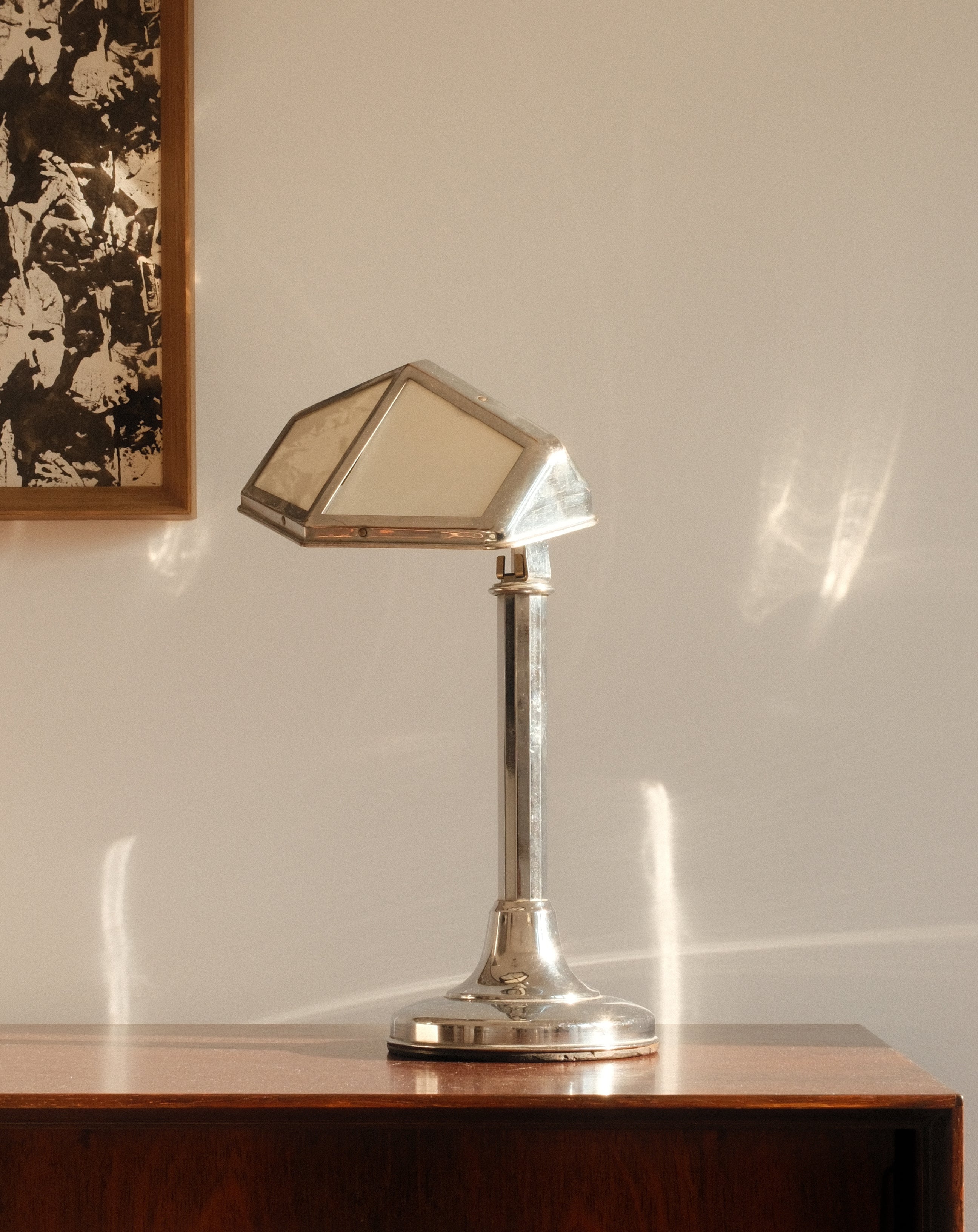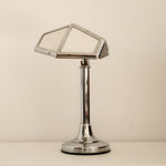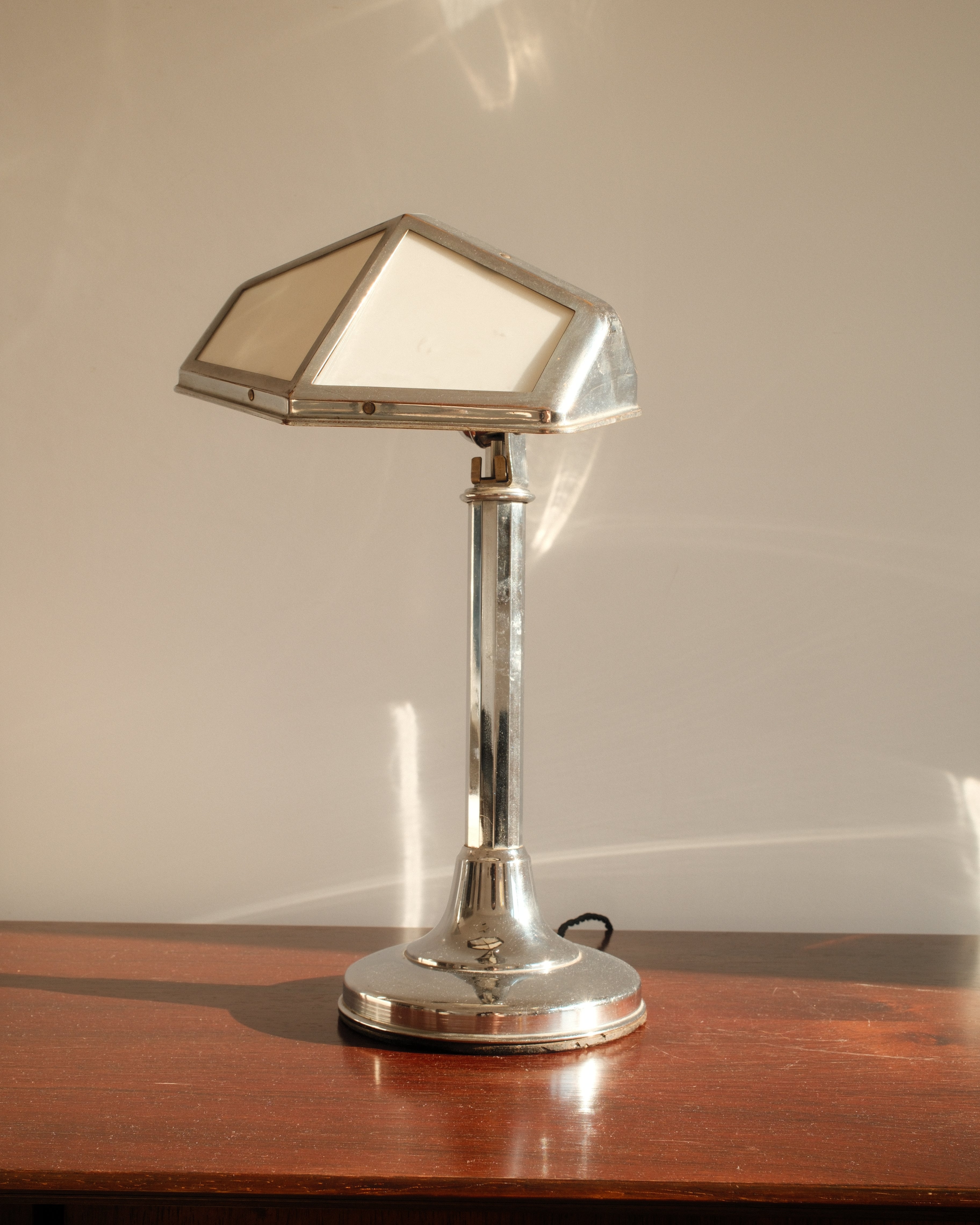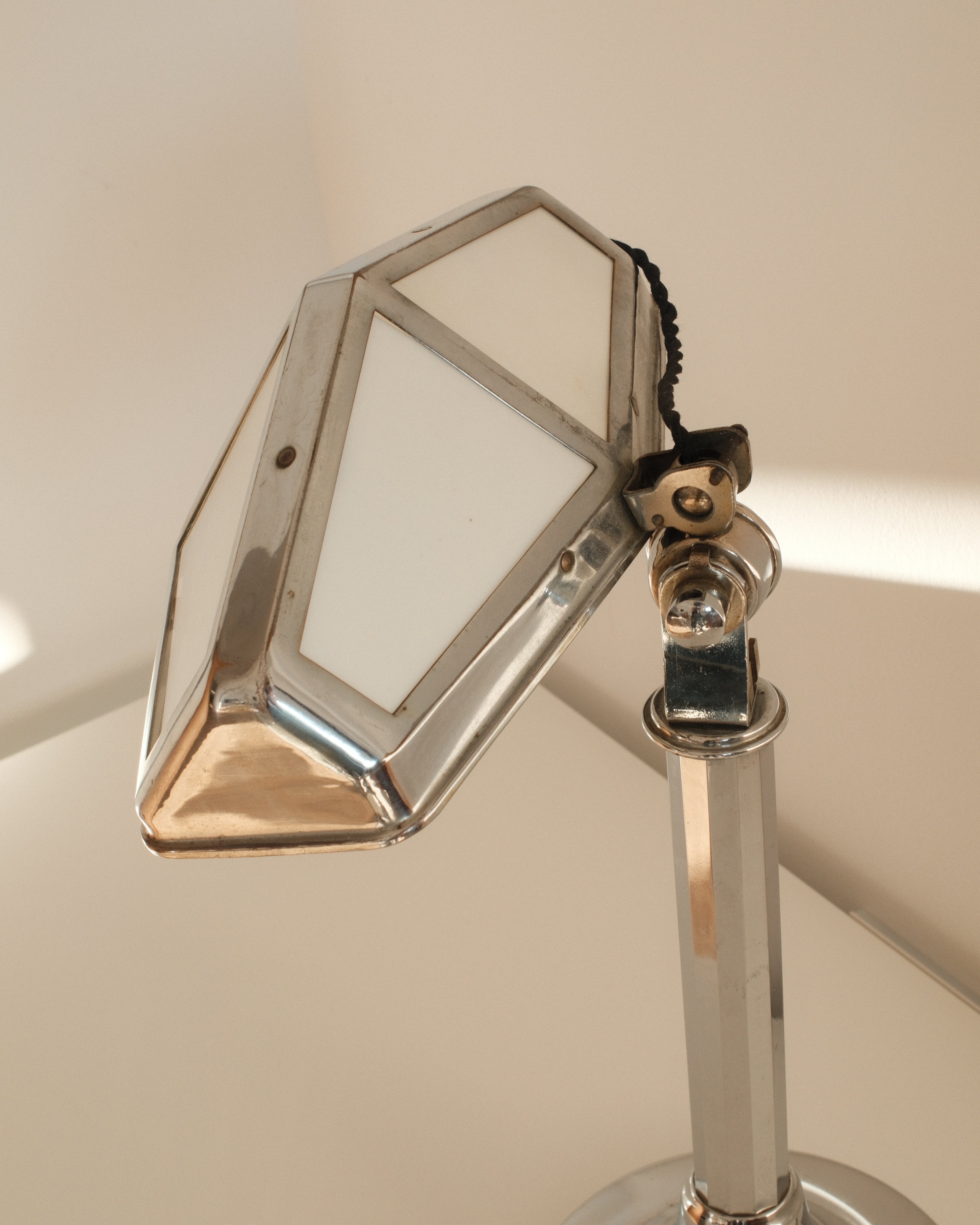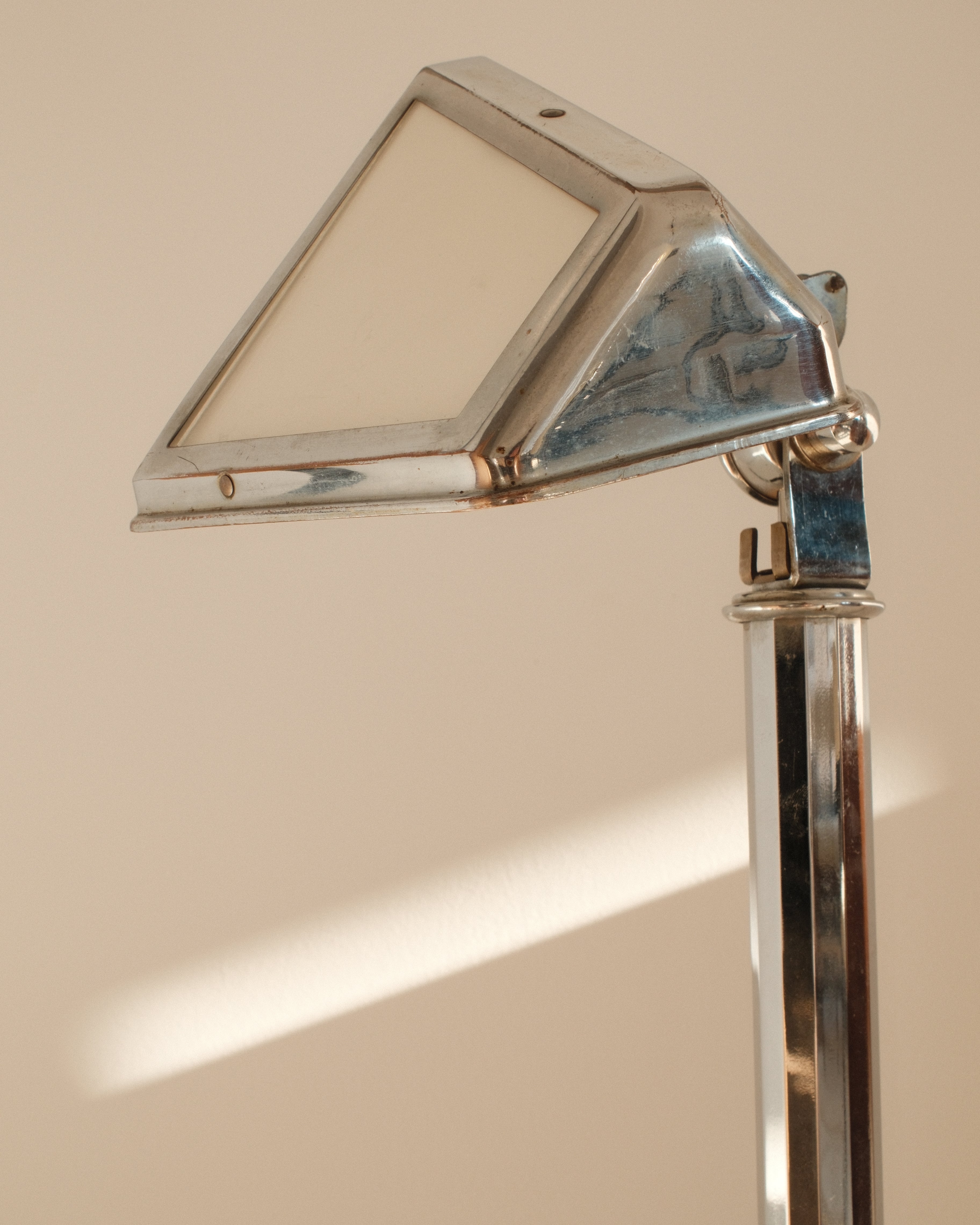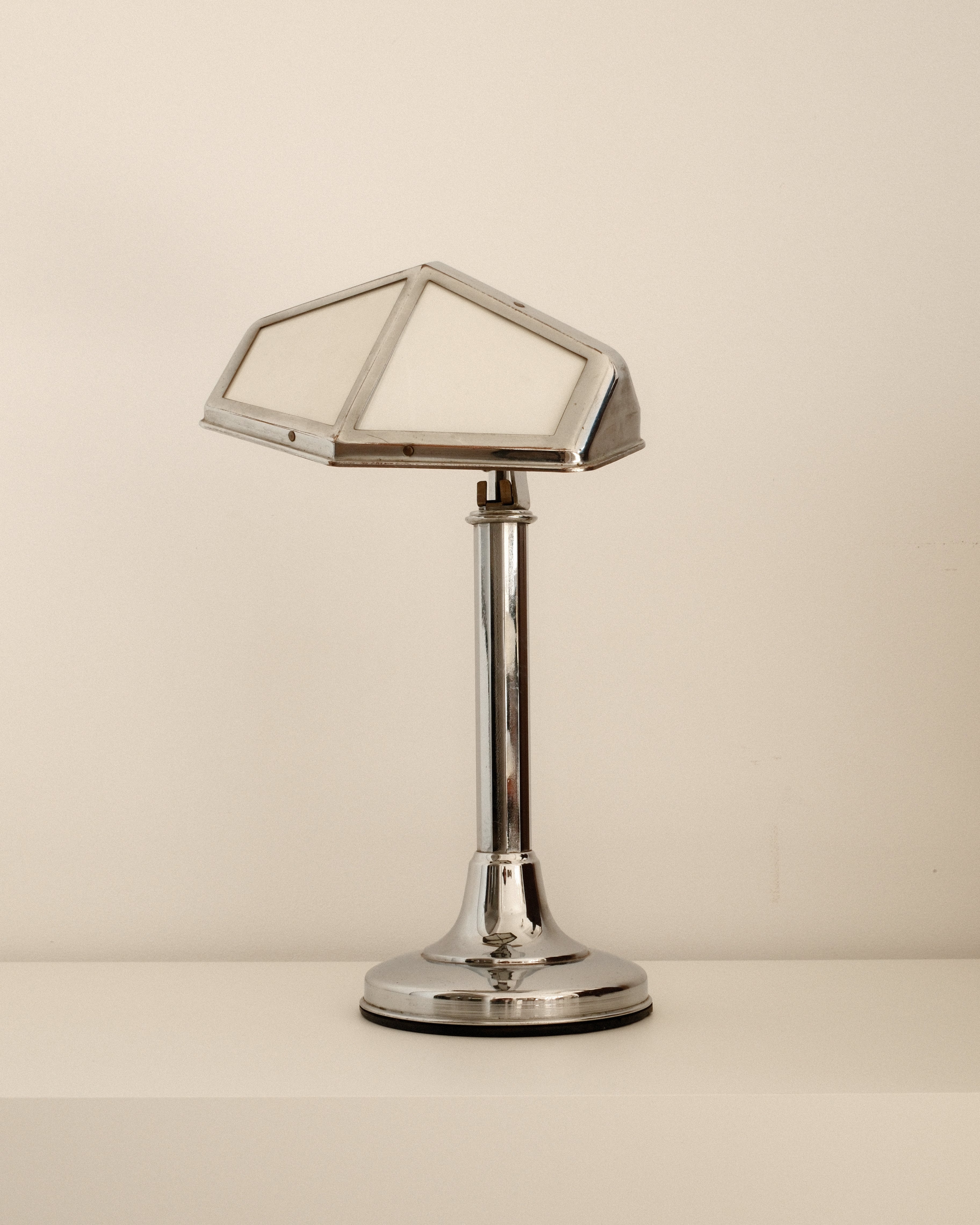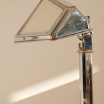 Its adjustable armature allows for flexible positioning, making it ideal for focused task lighting while maintaining an elegant profile. The bulb cover, composed of glass plates, softens and diffuses the light, creating a refined interplay between transparency and reflection. The chromed finish enhances its contemporary aesthetic, reflecting surrounding light and emphasizing the lamp’s sculptural geometry.
