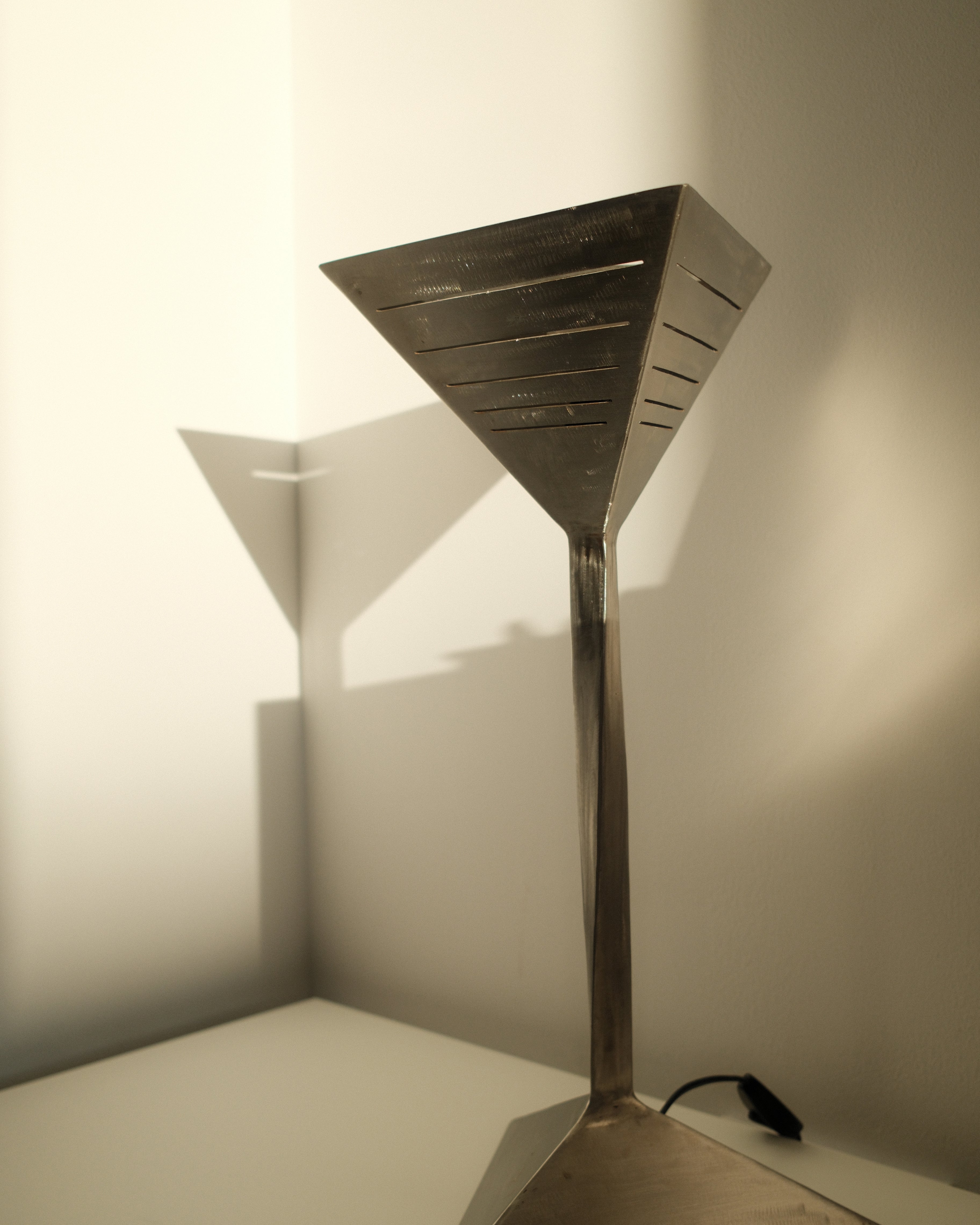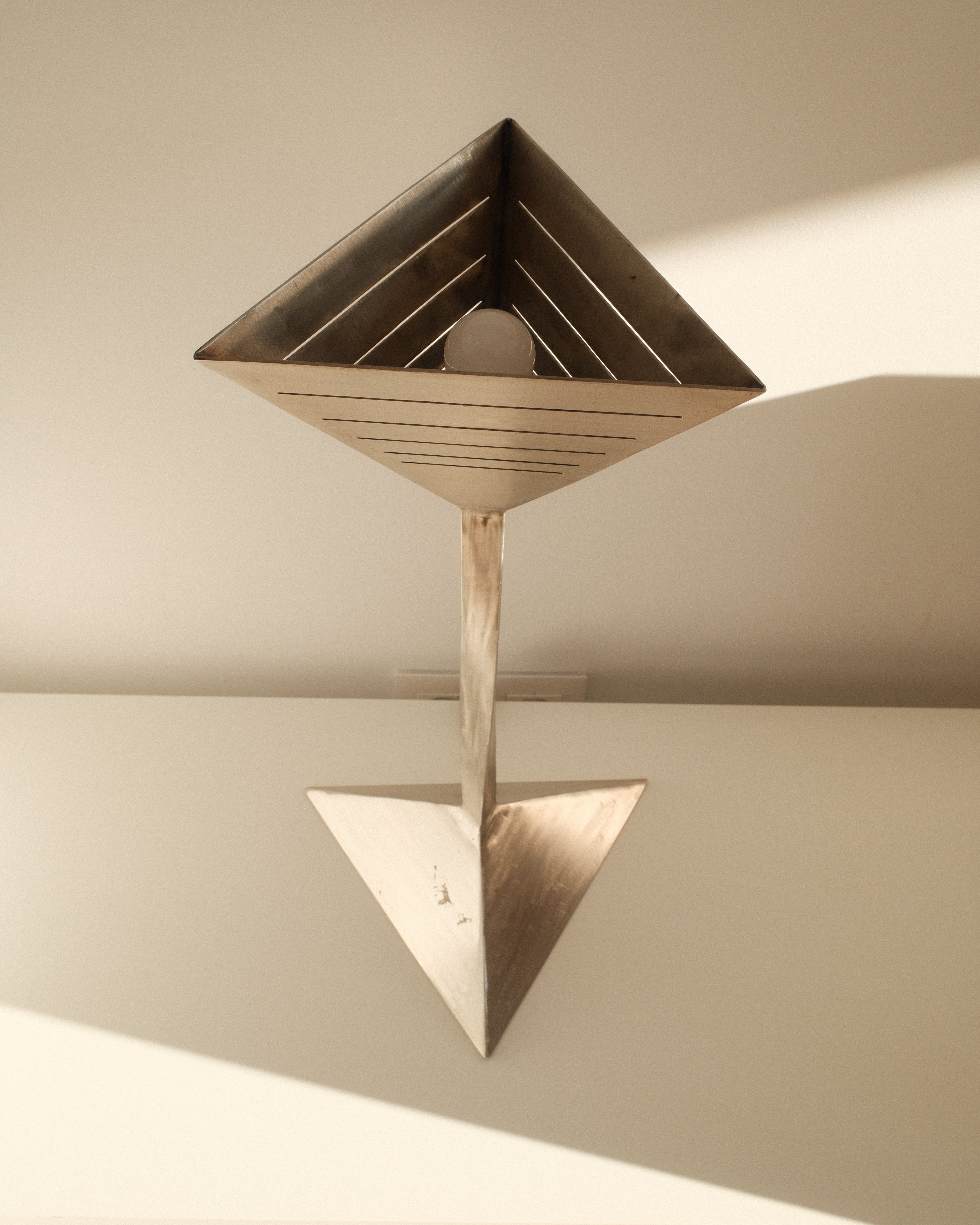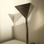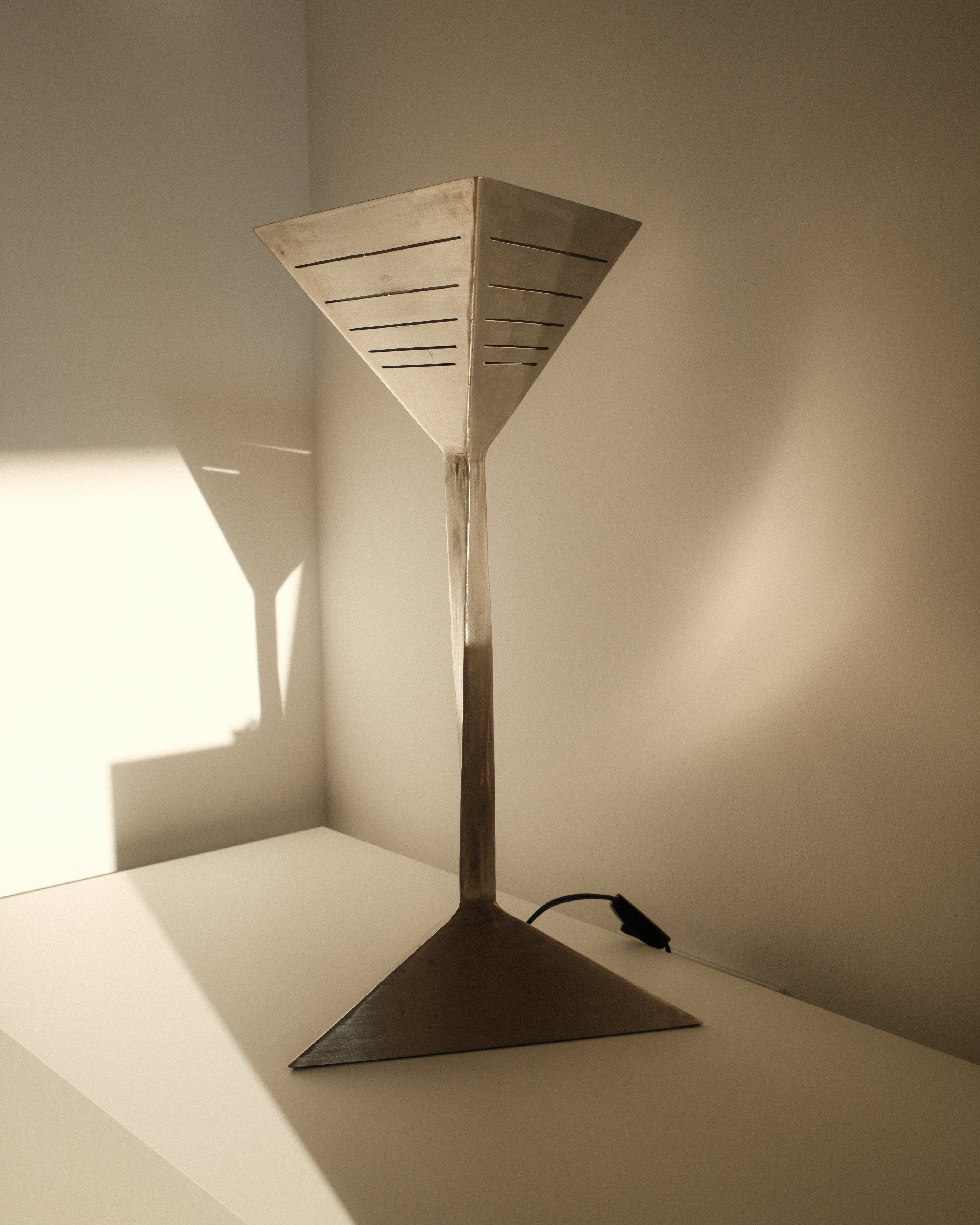 Crafted entirely in aluminum, the lamp embraces the industrial aesthetic characteristic of late 20th-century design. The matte metallic surface enhances its graphic quality, allowing light to reflect subtly across its planes. The sharply defined lines of both base and shade create a harmonious dialogue between form and function, resulting in a piece that feels both purposeful and sculptural.
