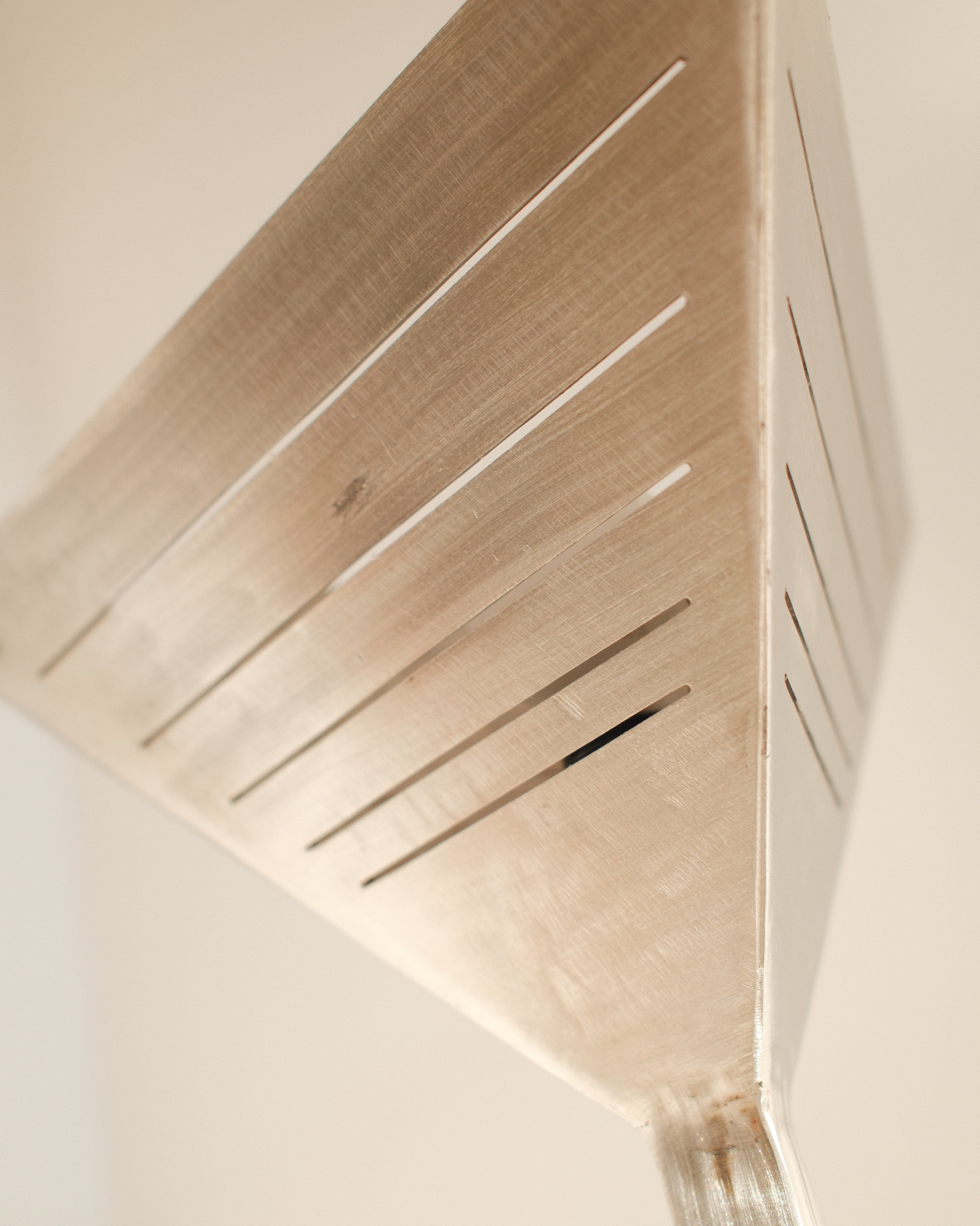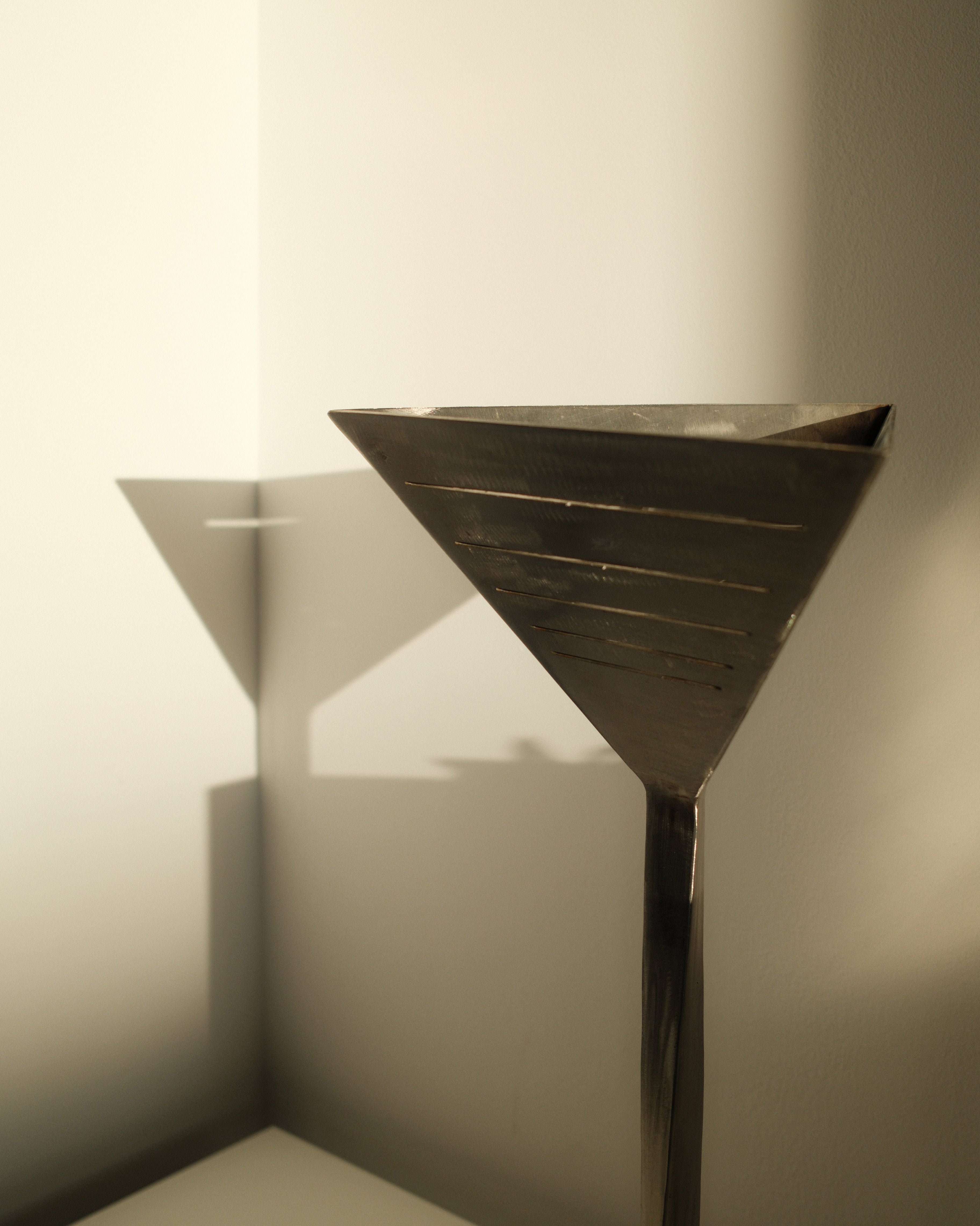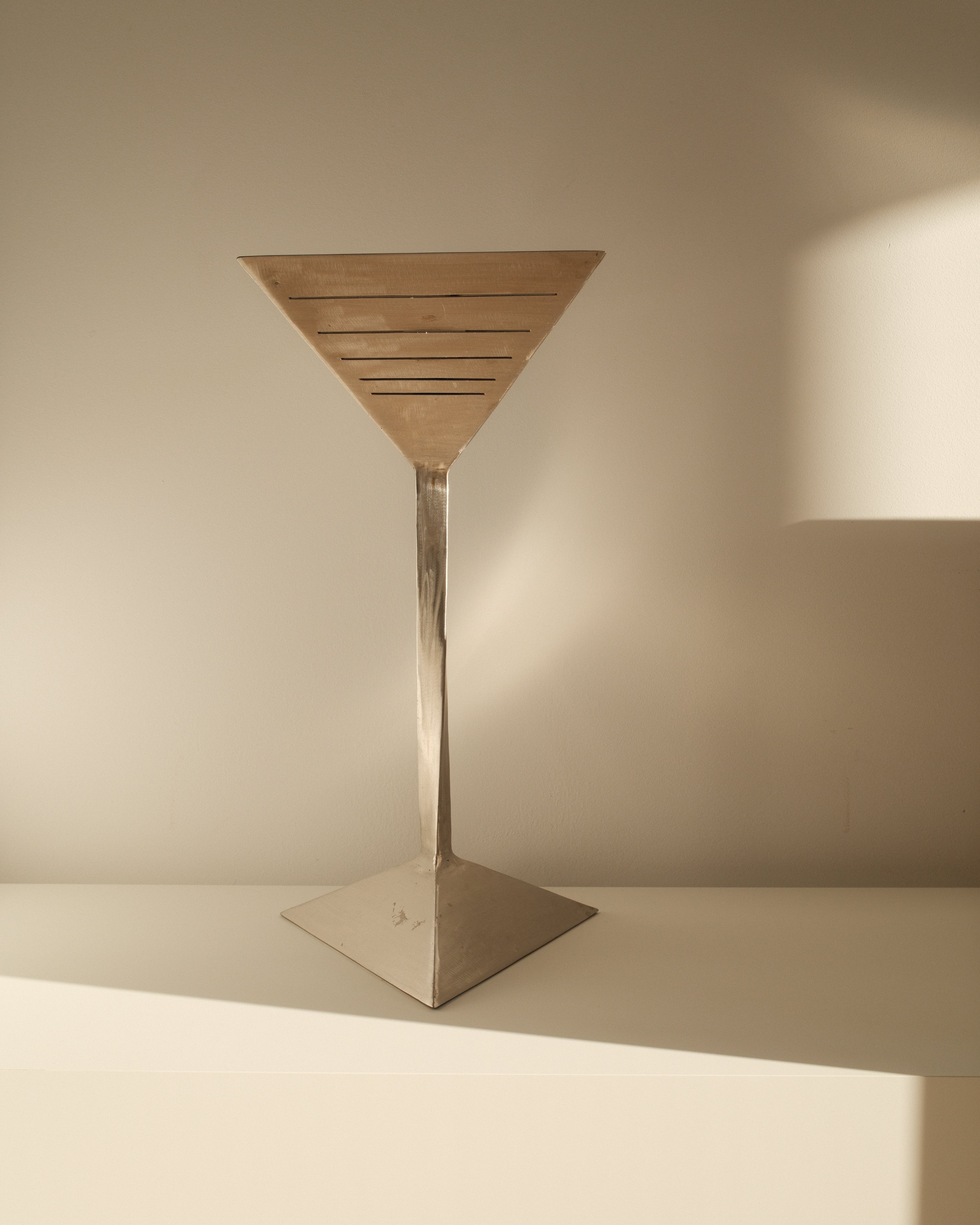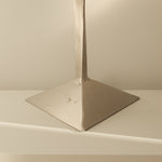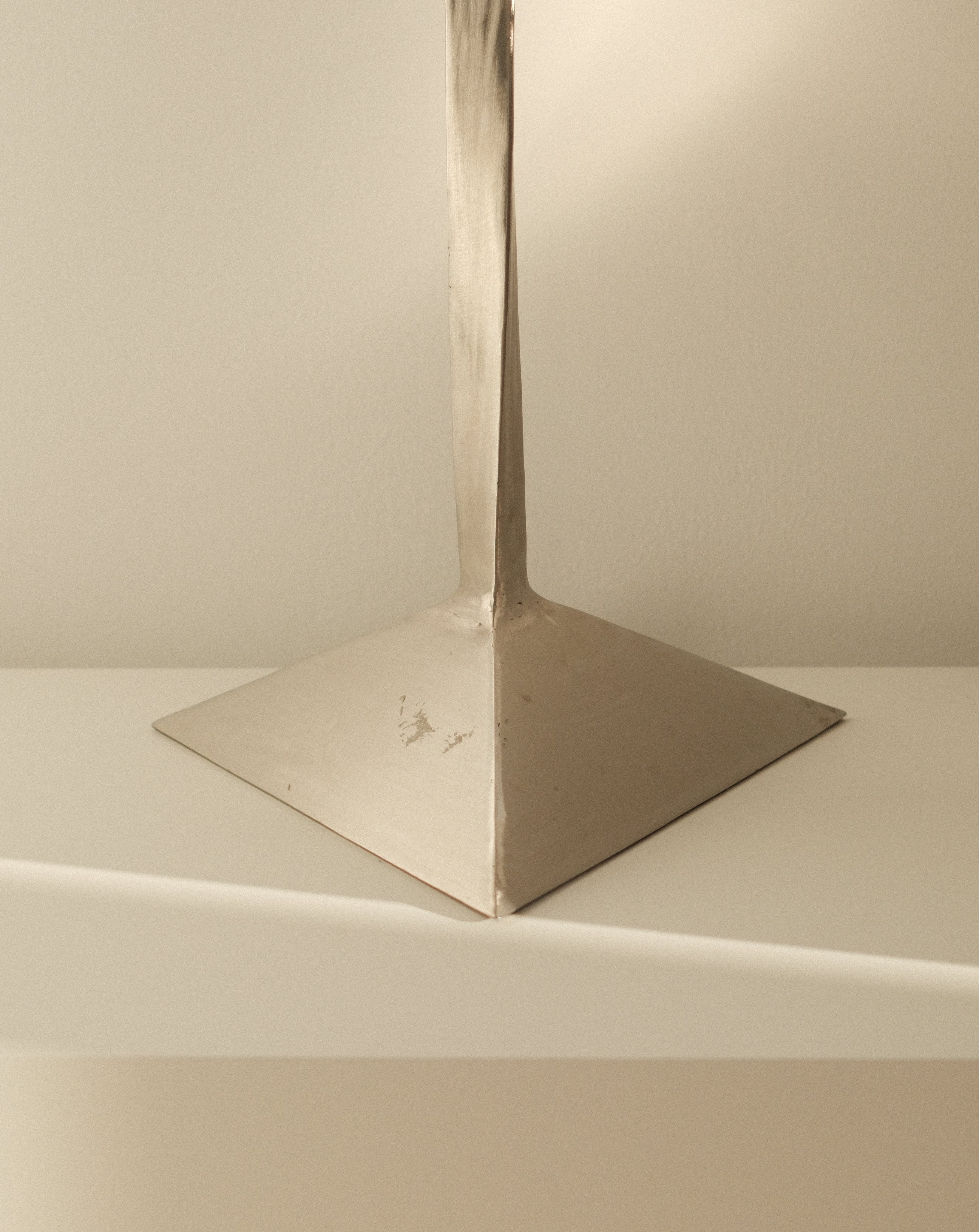 Crafted entirely in aluminum, the lamp embraces the industrial aesthetic characteristic of late 20th-century design. The matte metallic surface enhances its graphic quality, allowing light to reflect subtly across its planes. The sharply defined lines of both base and shade create a harmonious dialogue between form and function, resulting in a piece that feels both purposeful and sculptural.