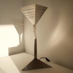 A sculptural aluminum table lamp dating from the Сirca 1970s–1980s, defined by its bold geometric clarity and minimalist presence. The design is structured around a striking triangular base that anchors the composition with architectural precision, while the matching angular diffuser reinforces its clean, modernist silhouette.