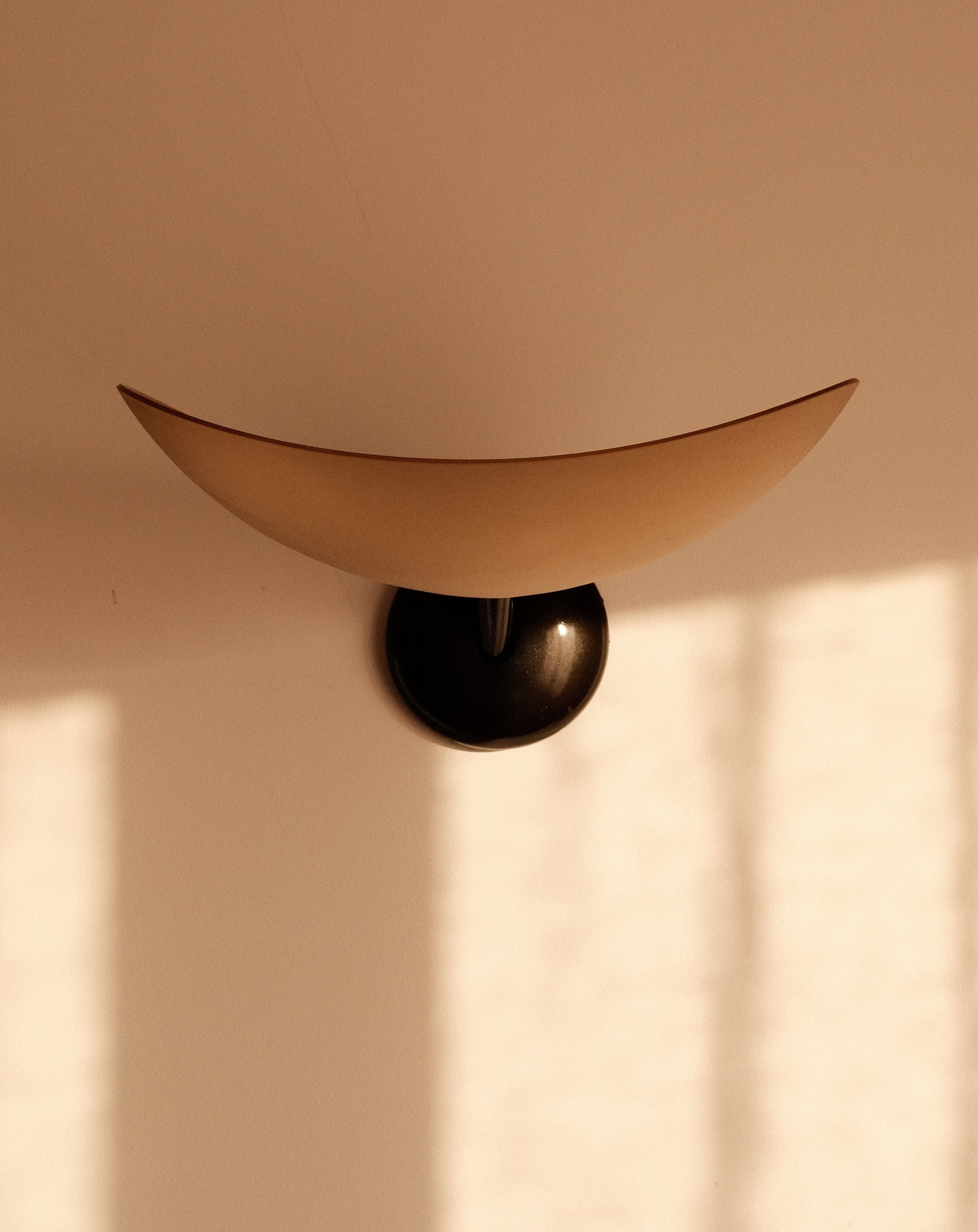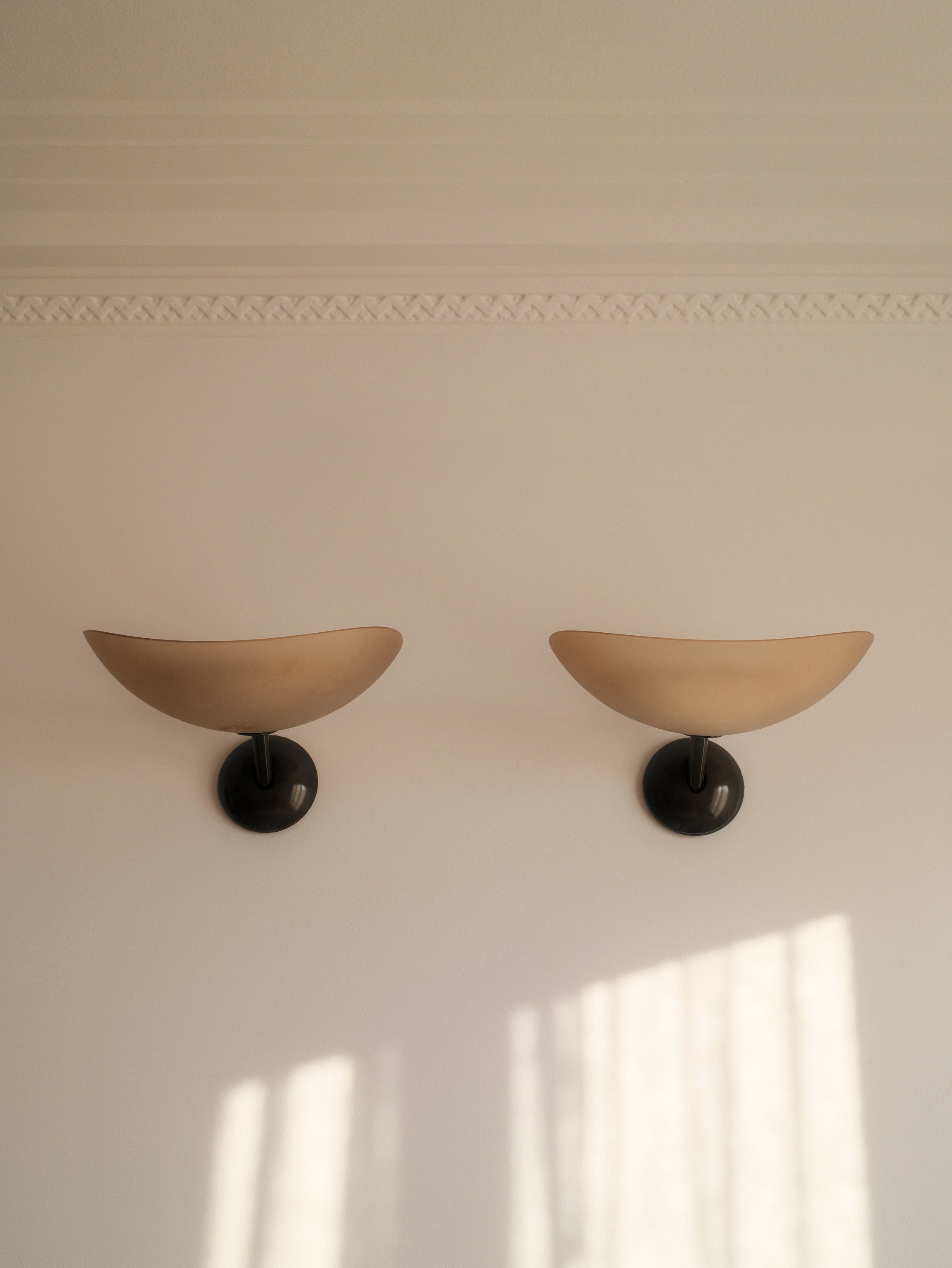 Pair of wall sconces designed by Ernesto Gismondi for Artemide, Italy, circa 1980. Each sconce features a curved panel of satin-finished amber glass mounted on a lacquered metal base. The softly etched surface gently diffuses light, producing a warm, atmospheric glow. With its clean geometry and restrained palette, the design reflects the quiet clarity of late 20th-century Italian lighting.